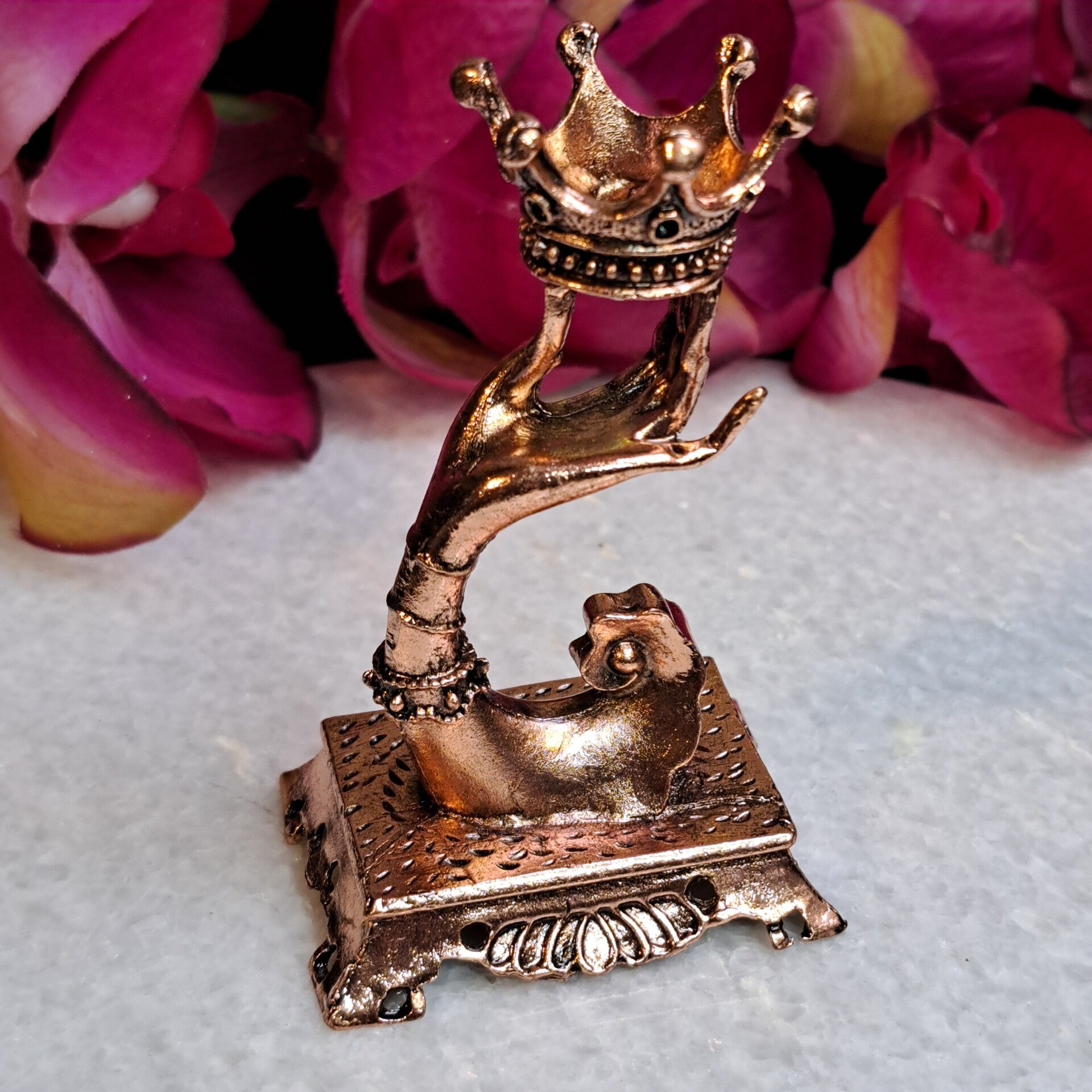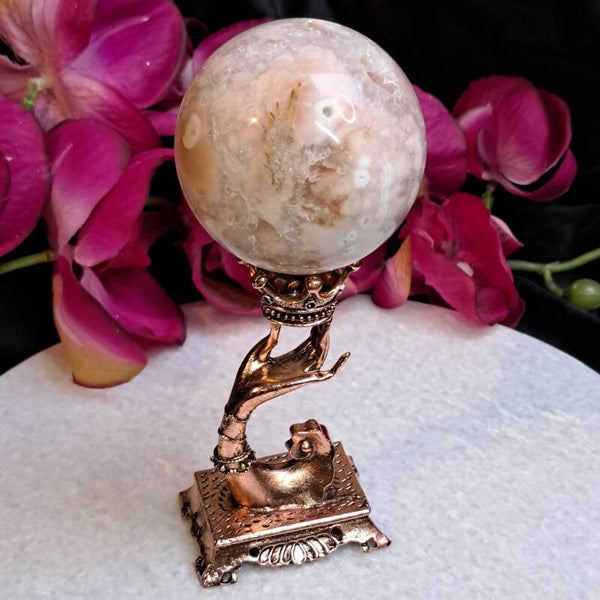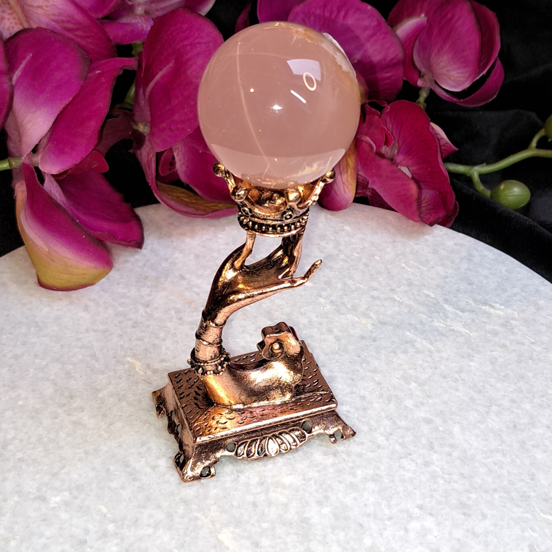 Mooie bolhouder van metaal in rosekleur en geschikt voor bollen van 3 tot ongeveer 6,5 cm.De hoogte van de houder zonder bol is 9 cm.