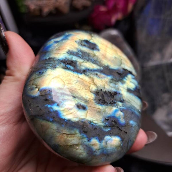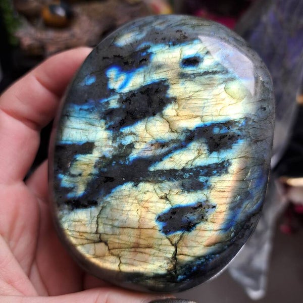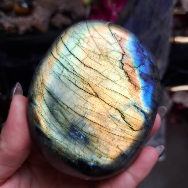 Deze gave xxl jumbosteen van labradoriet heeft een prachtige, flash aan beide kanten en is 476 gram en 10 cm groot.