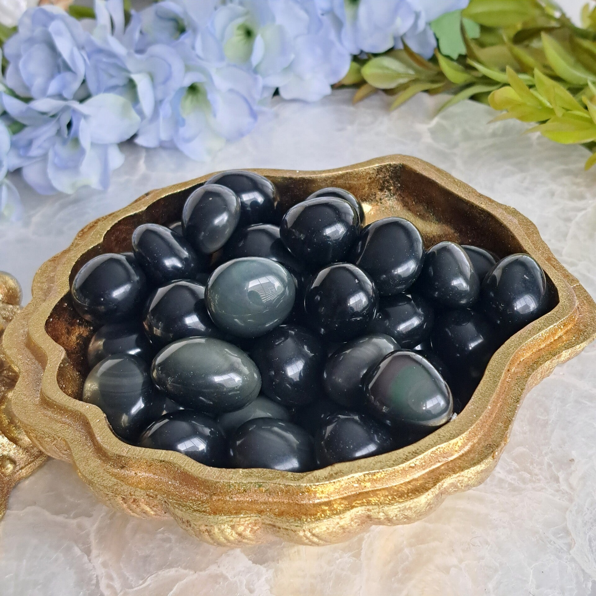 Deze mooie trommelstenen van zilver obsdiaan hebben een toffe veelal meerkleurige flash en zijn ongeveer 3 cm groot.
