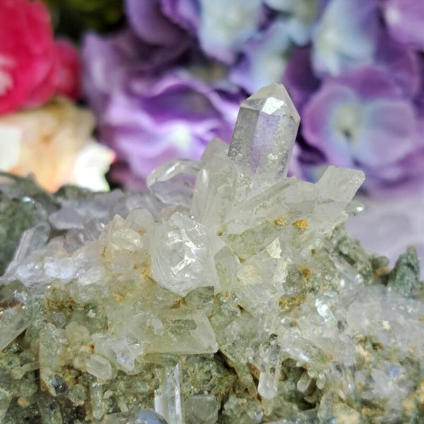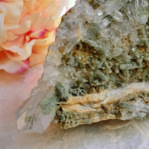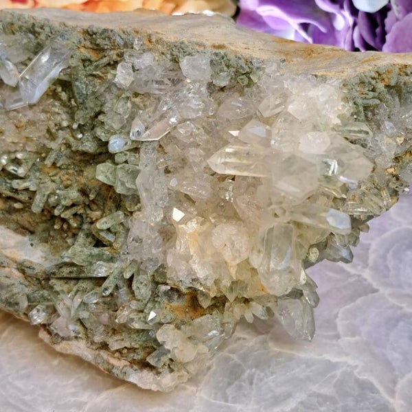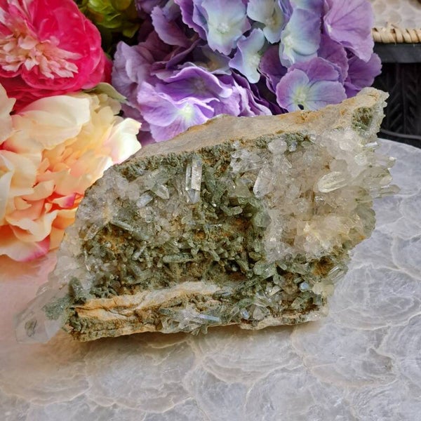 Prachtige groot cluster van Chloriet Kwarts uit Pakistan. Dit gave stuk heeft kristalvorming aan beide zijden en kan dus ook aan beide kanten neergezet worden.