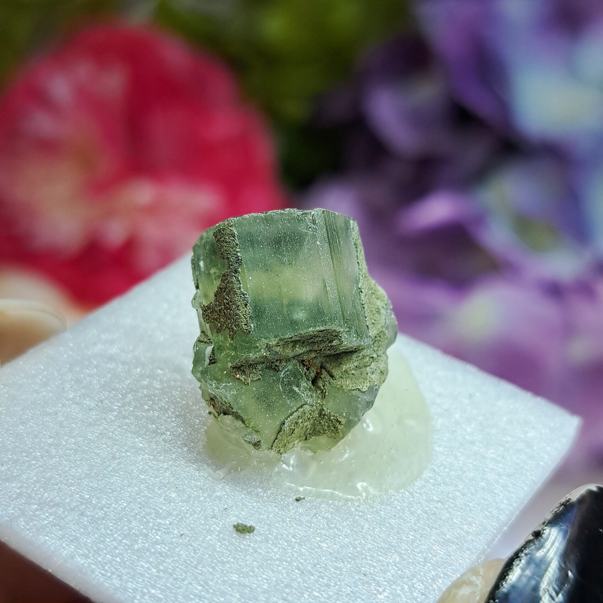 Apatiet is een zachte en brosse steen die makkelijk beschadigd, de kristalvorming onder de oppervlakte lijkt ook te zijn gebarsten.