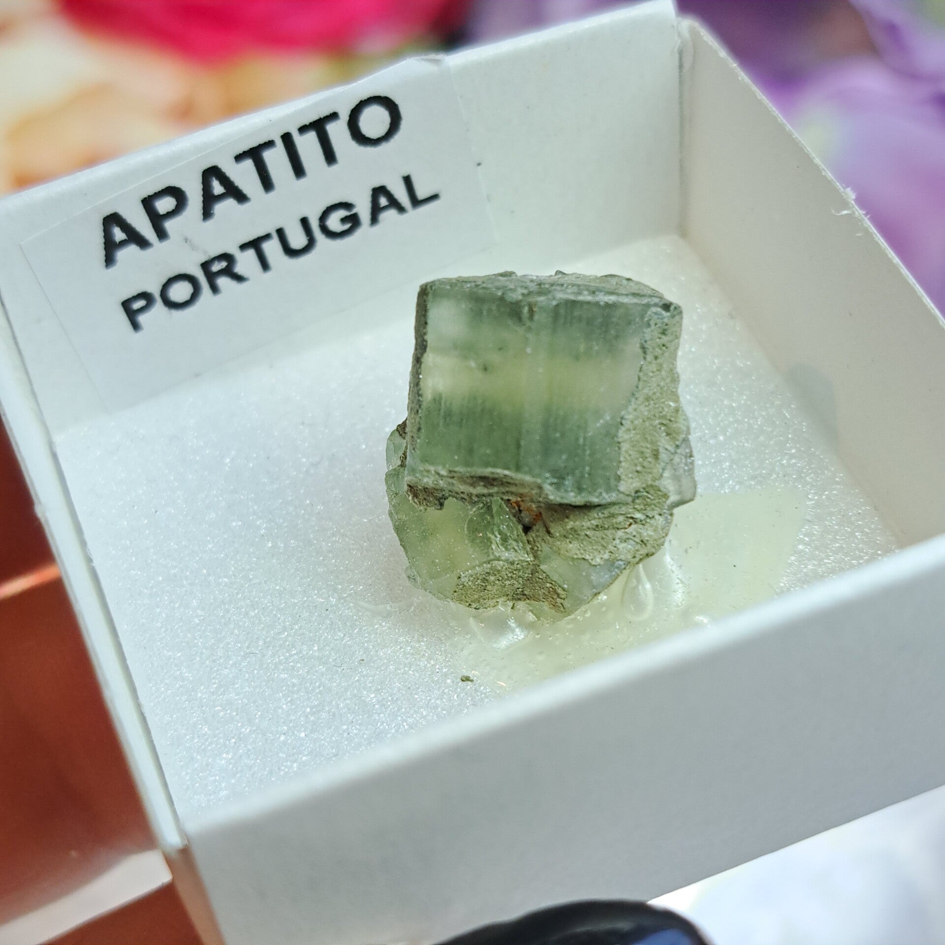 Wat een toffe ruwe clustertjes! Dit groene apatiet kristal cluster komt uit de Panasqueira Mijn in Portugal en komt inclusief het kartonnen verzameldoosje (4x4cm).