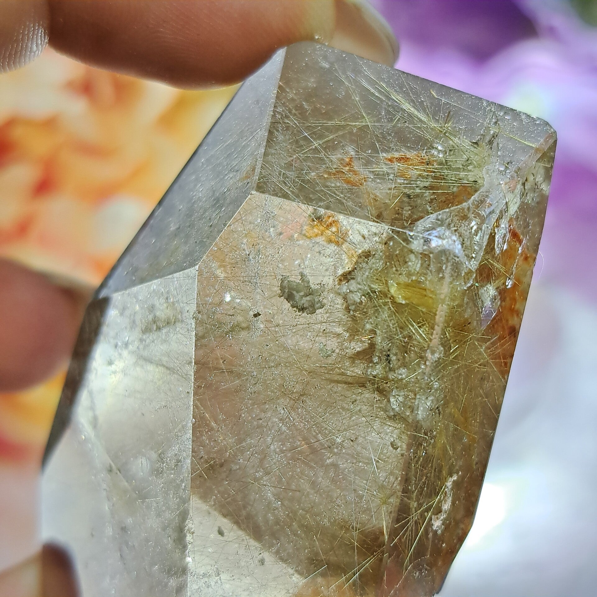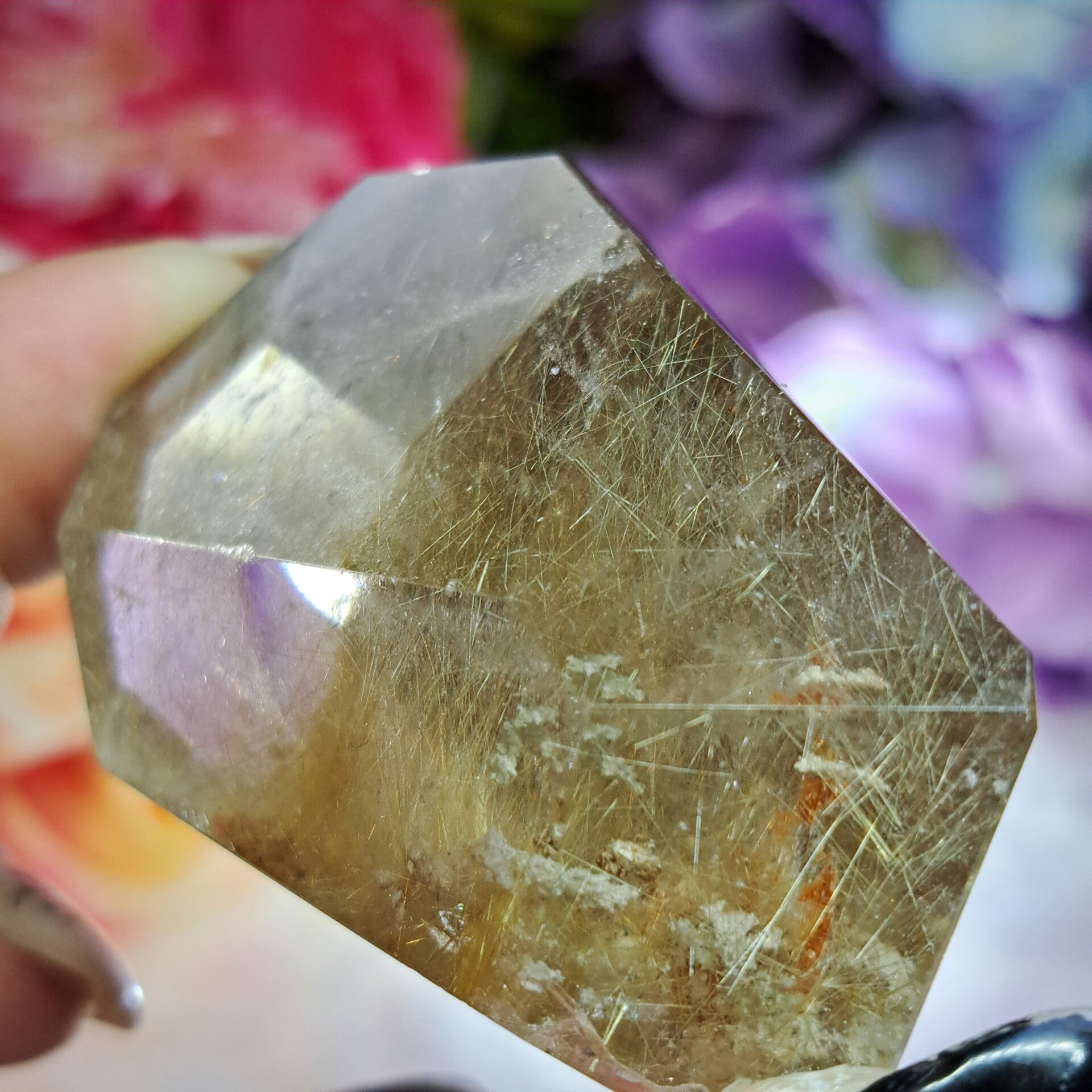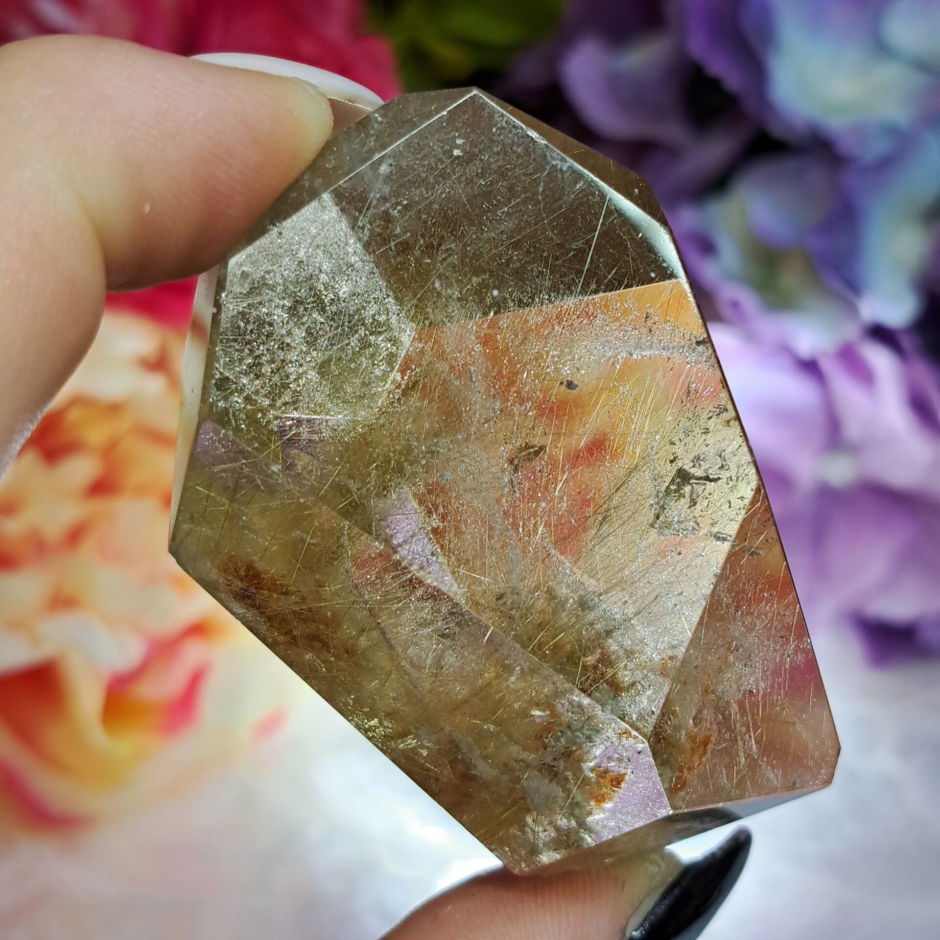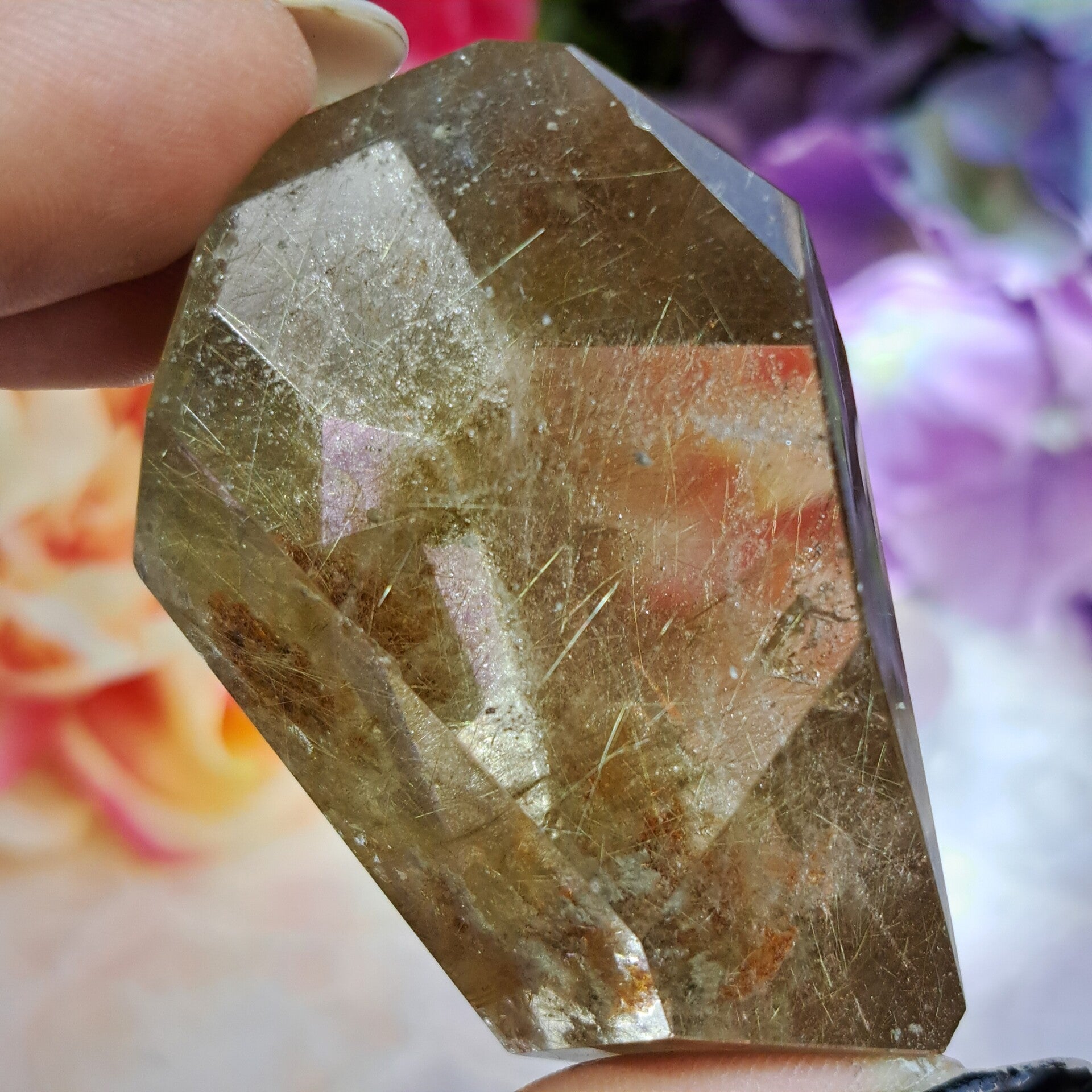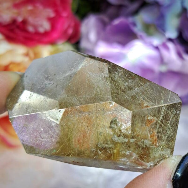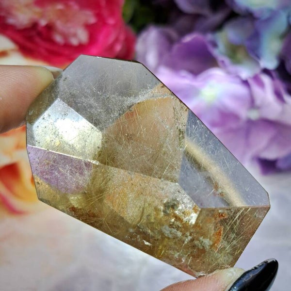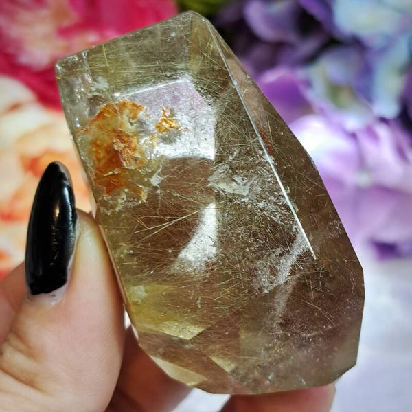 Dit enorm heldere gave sculptuur zit vol bomvol goudkleurige naalden, heeft wat lodoliet insluitingen en is 6 cm groot en weegt 85 gram.