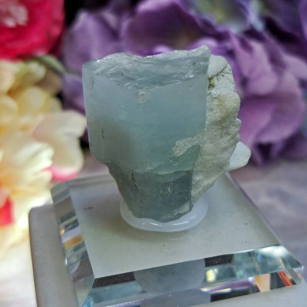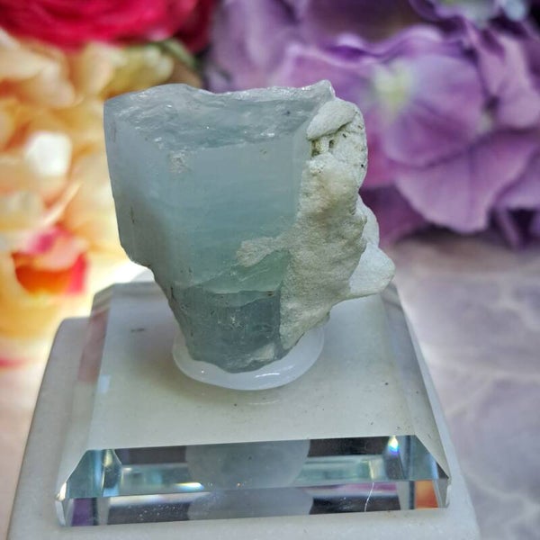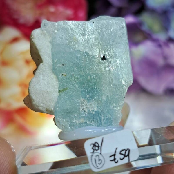 Dit ruwe stuk aquamarijn in combinatie met albiet komt uit Skardu, Pakistan en is 5,5 cm groot en staat op een glazen plaatje.