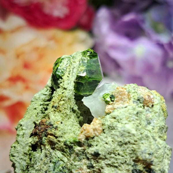 Andradiet Granaat is een calcium ijzergranaat met wisselende compositie en de mogelijkheid tot uiteenlopende kleuren, deze groene versie noemen we Demantoid Andradiet, de zwarte variant heet Melaniet Andradiet en de gele vorm heet Topazoliet.