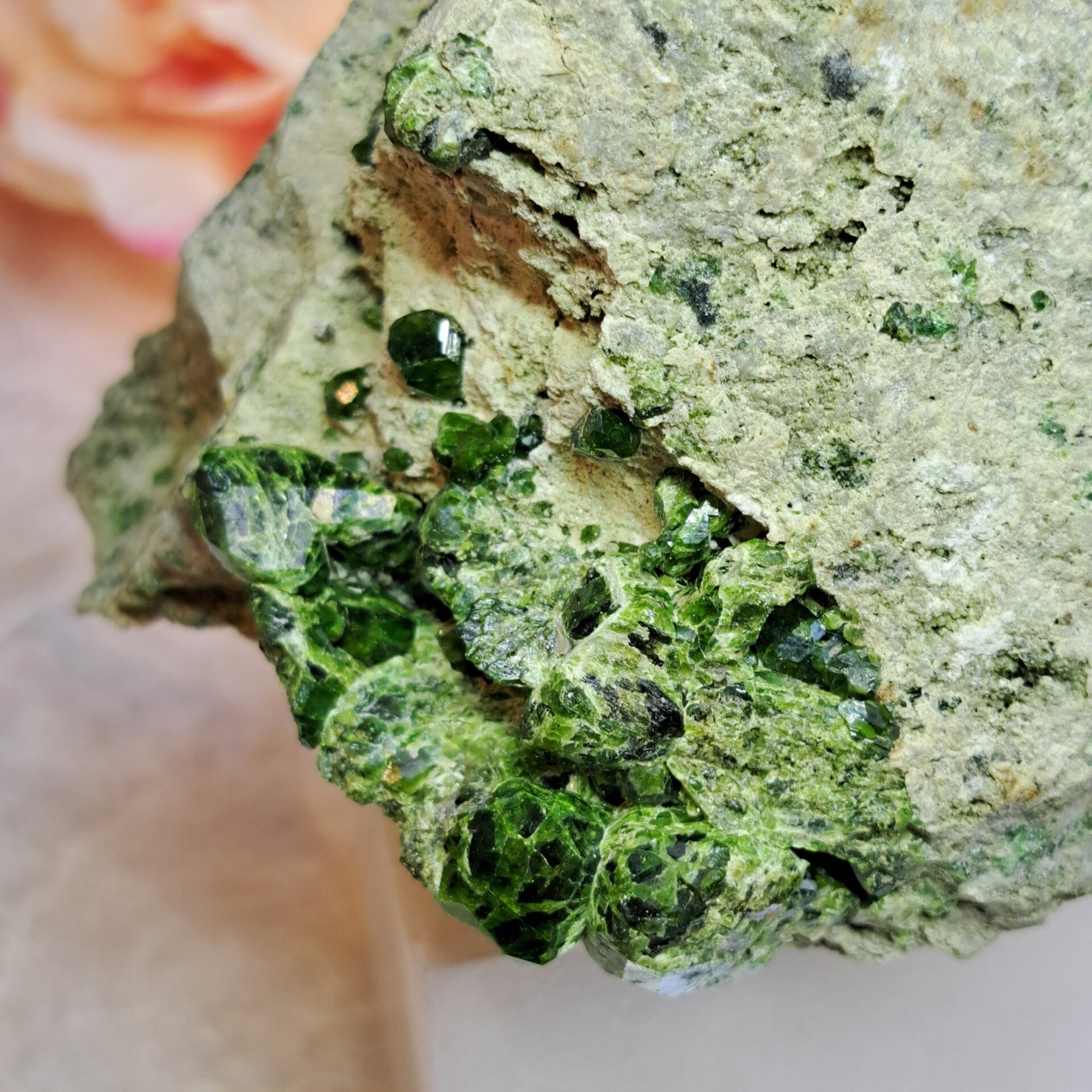 Andradiet Granaat is een calcium ijzergranaat met wisselende compositie en de mogelijkheid tot uiteenlopende kleuren, deze groene versie noemen we Demantoid Andradiet, de zwarte variant heet Melaniet Andradiet en de gele vorm heet Topazoliet.