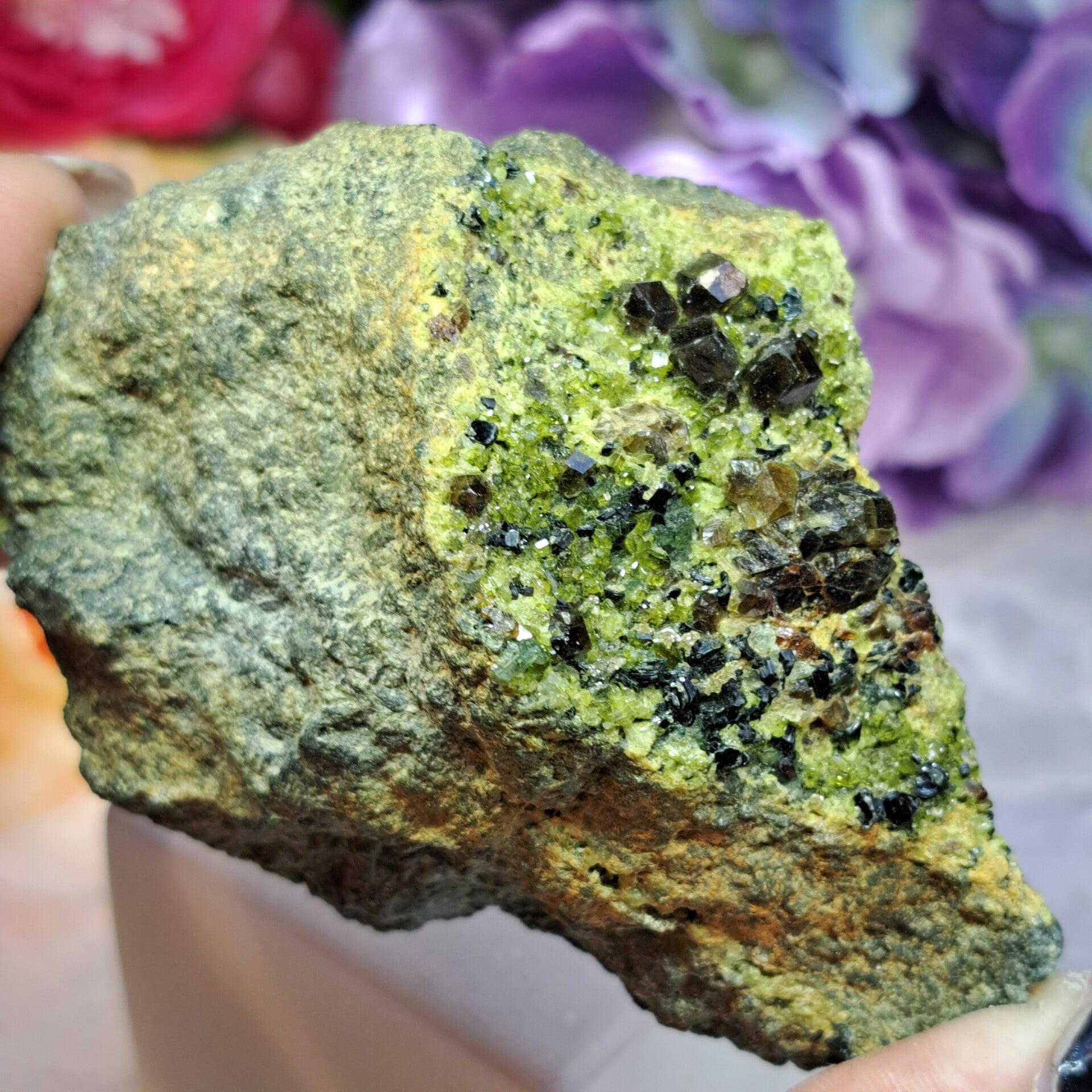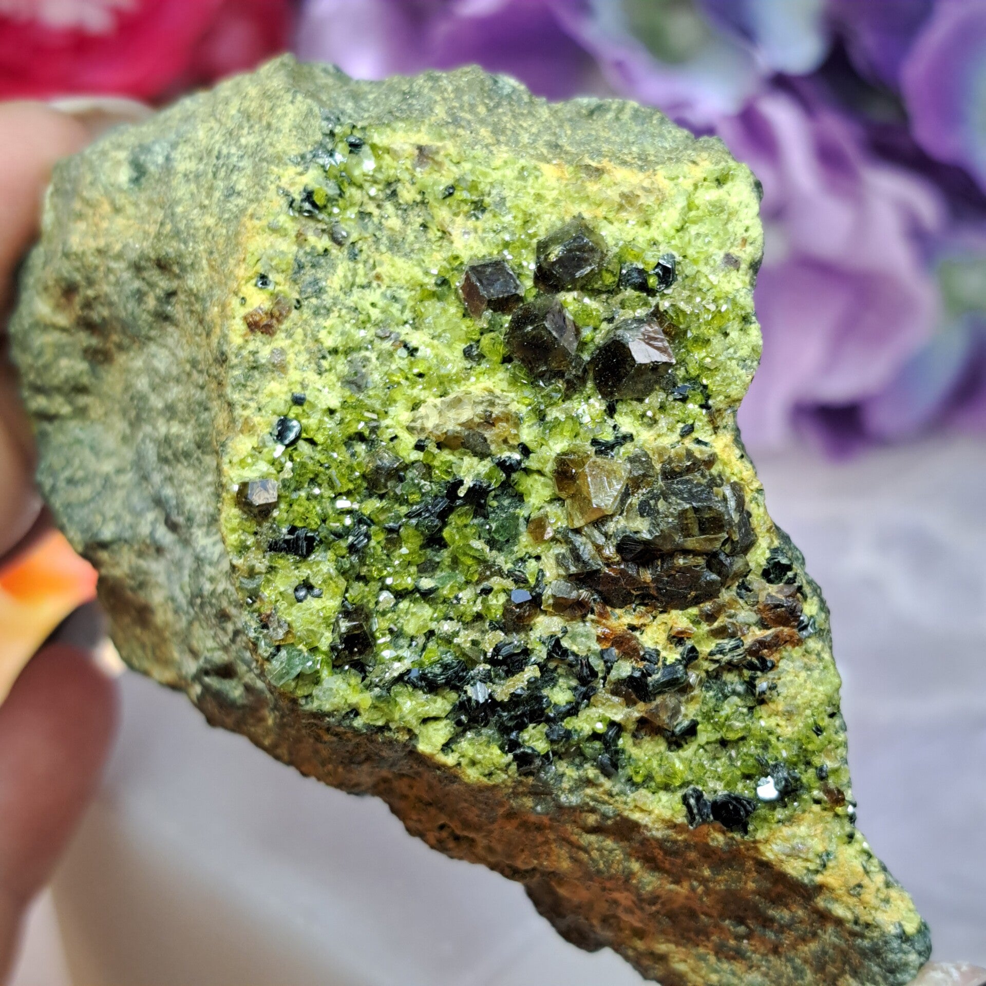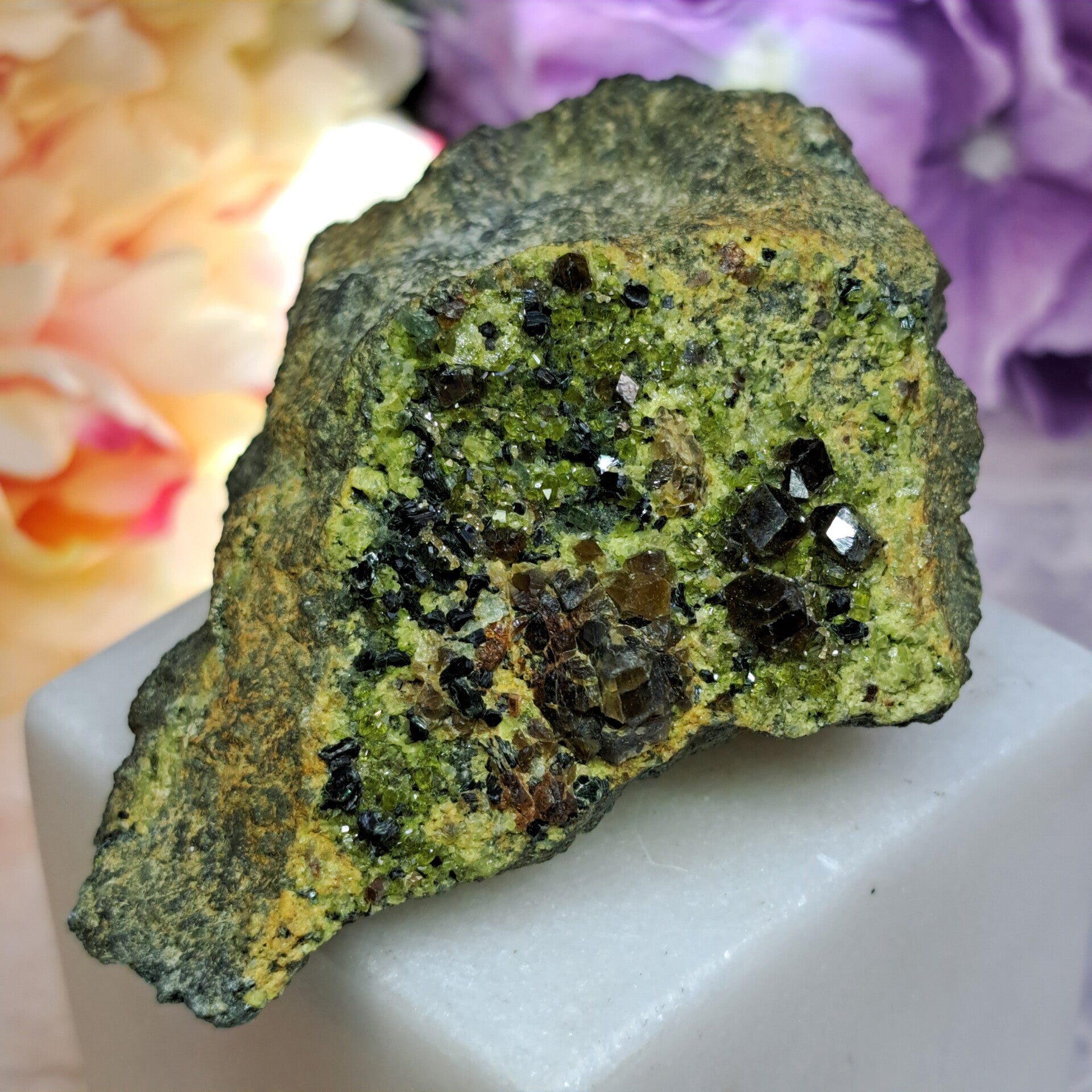 Andradiet Granaat is een calcium ijzergranaat met wisselende compositie en de mogelijkheid tot uiteenlopende kleuren, deze zwarte versie Melaniet Andradiet, De Groene versie noemen we Demantoid Andradiet, en de gele vorm heet Topazoliet.