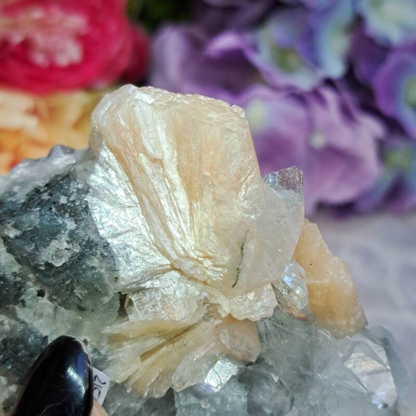 Deze toffe vorm van Apofyliet heeft haar prachtige grijzige kleur dankzij een basis van grijze chalcedoon, dit ruwe bijzondere verzamelstuk heeft ook wat stilbiet en komt uit Maharashtra India.