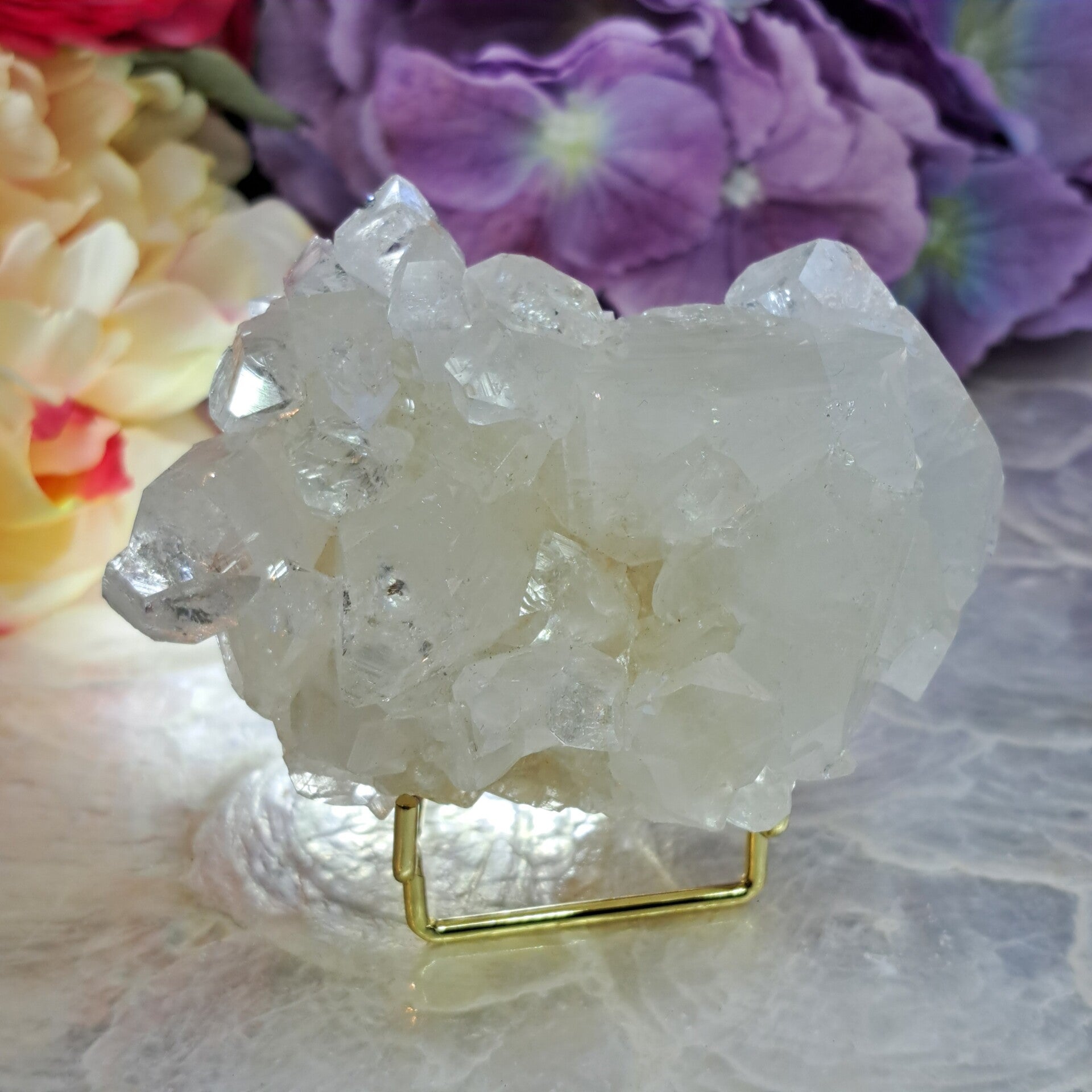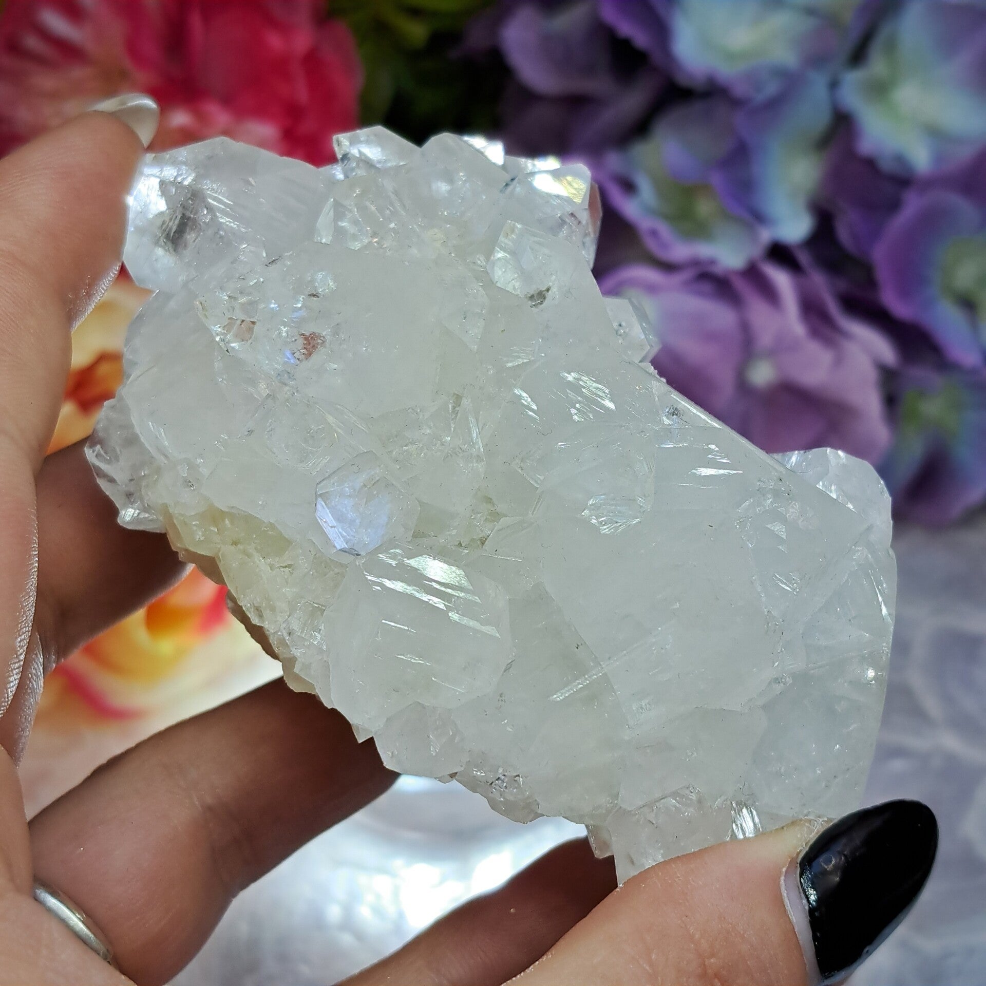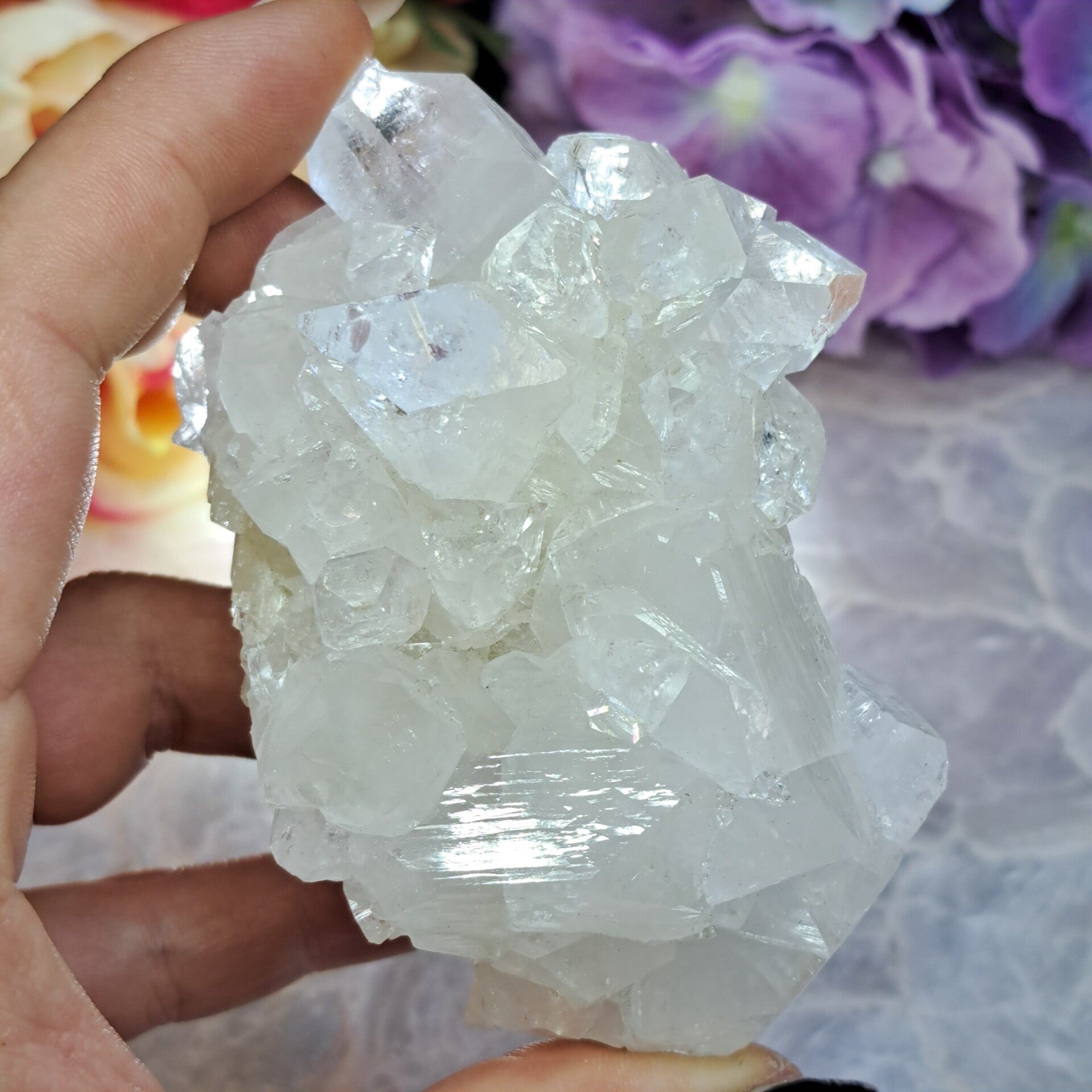 Dit prachtige spiegel apofyliet cluster met prachtige schitteringen, regenbogen en heel veel kleine kristallen komt uit Maharashtra India.