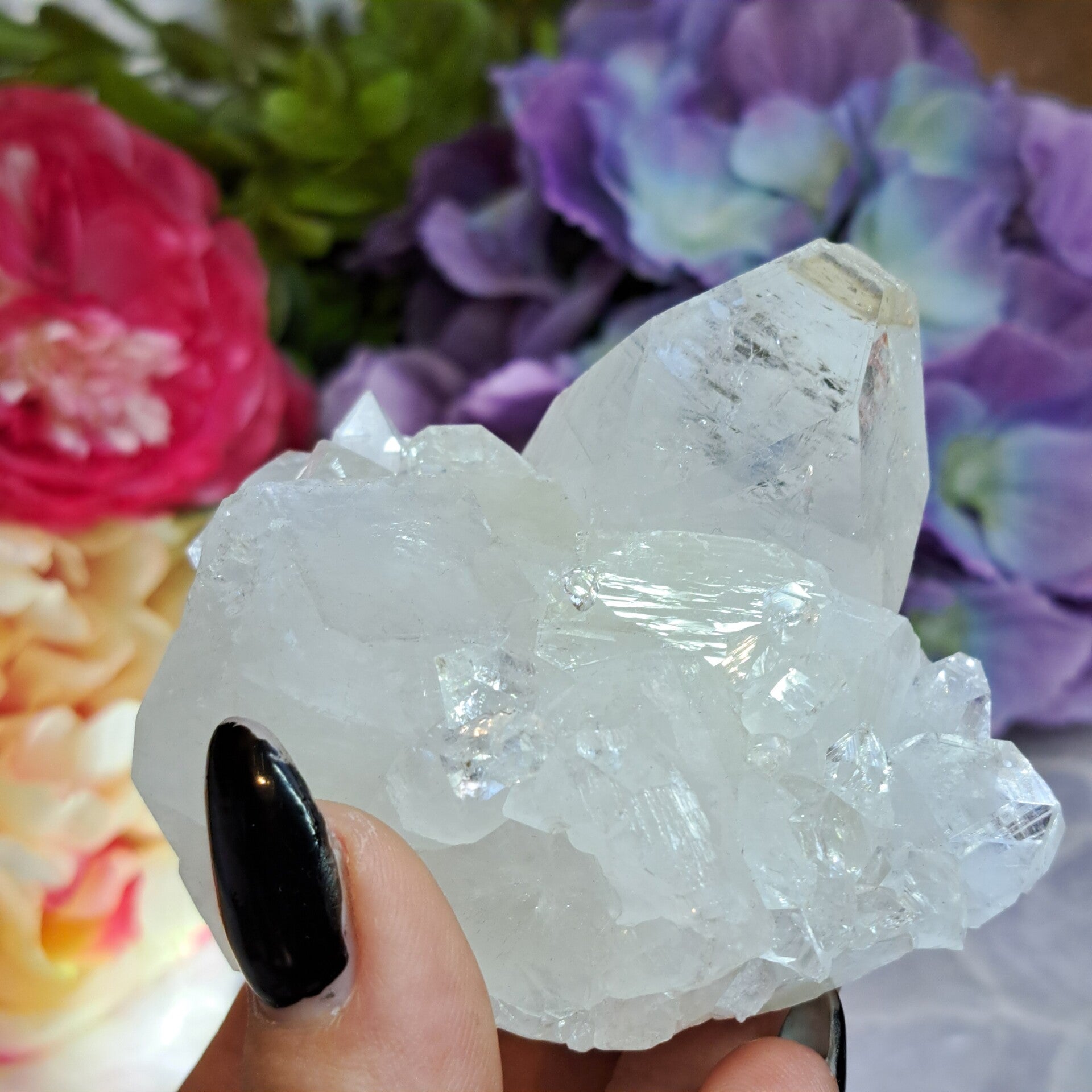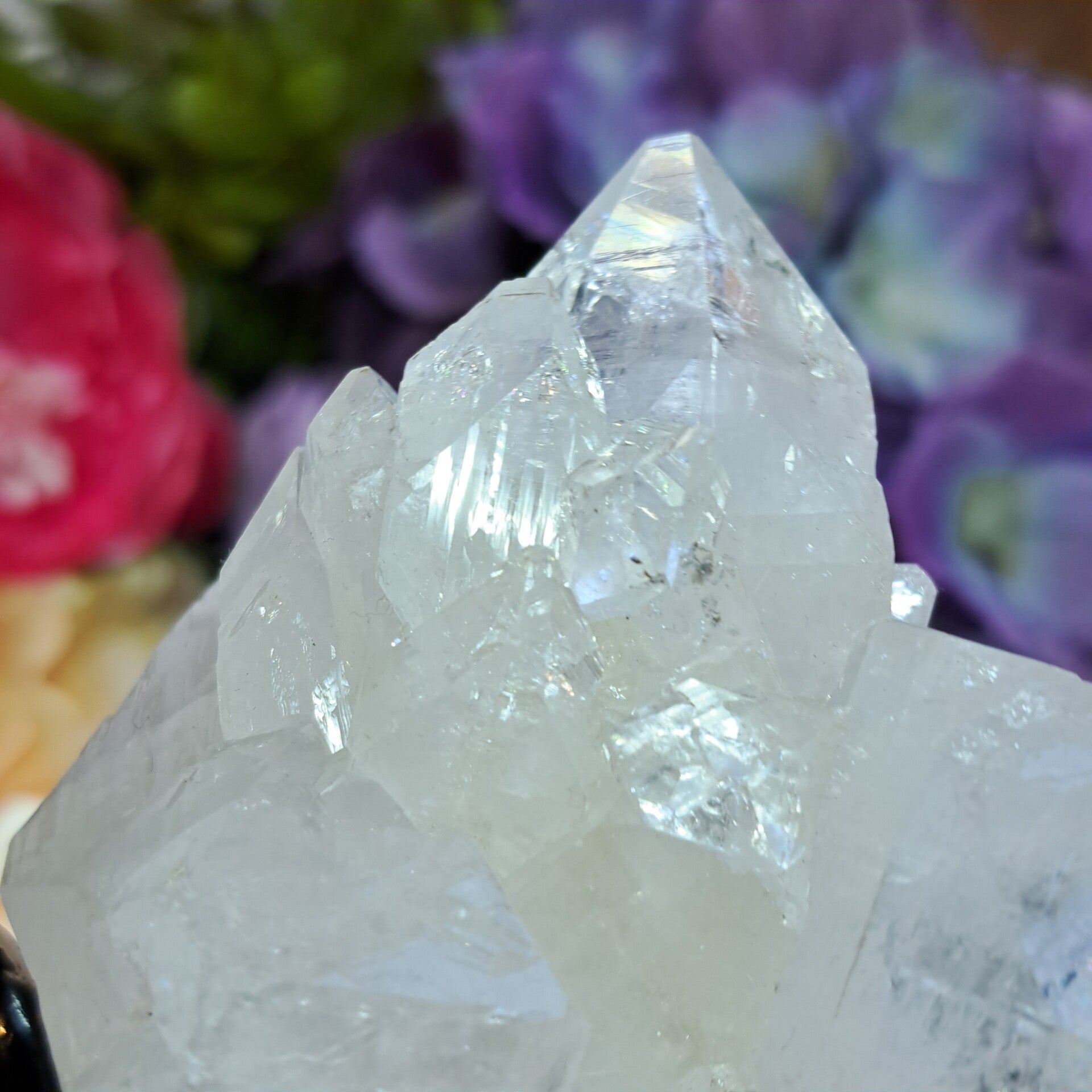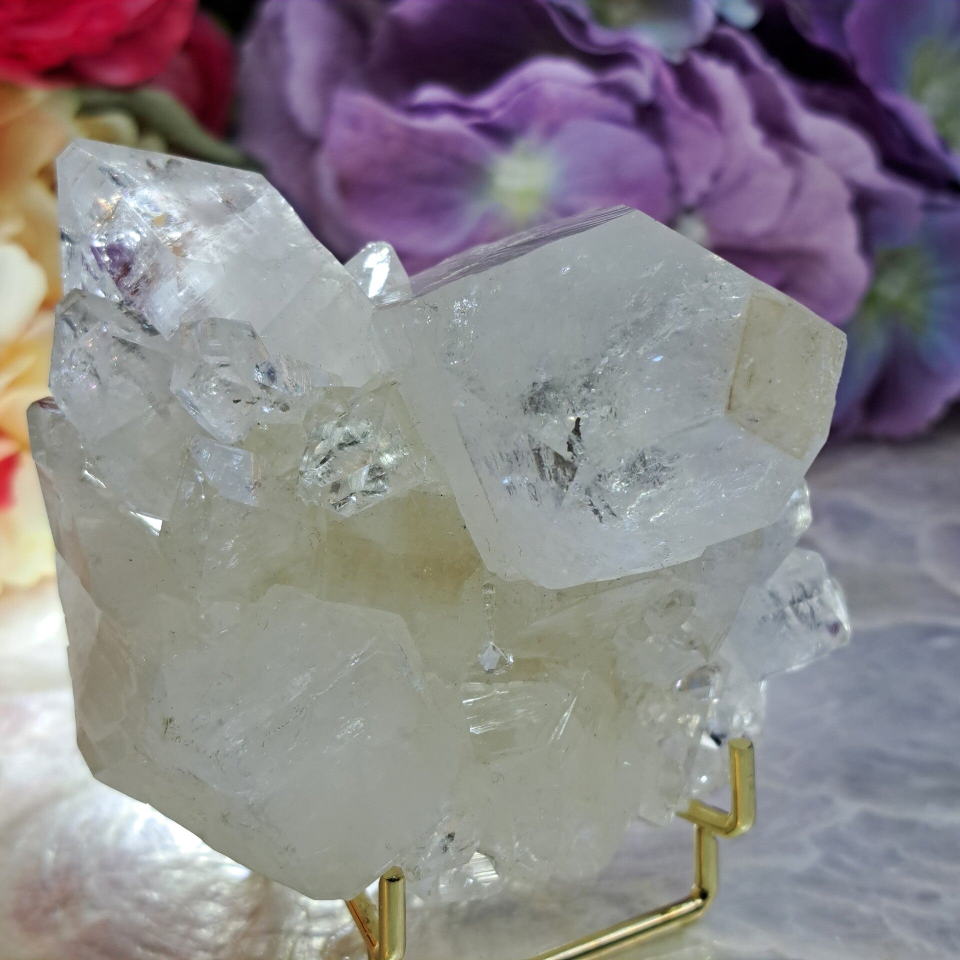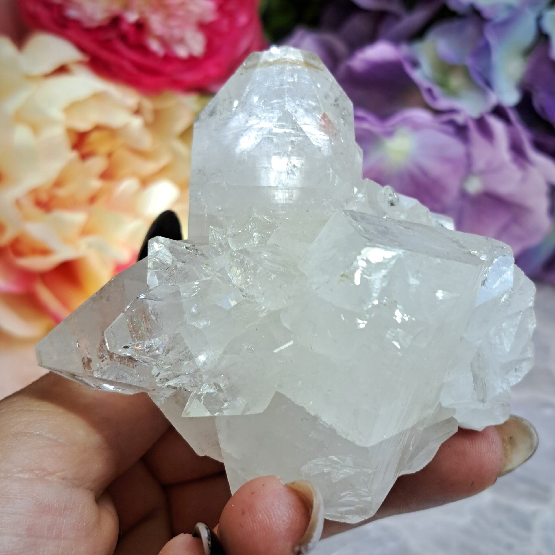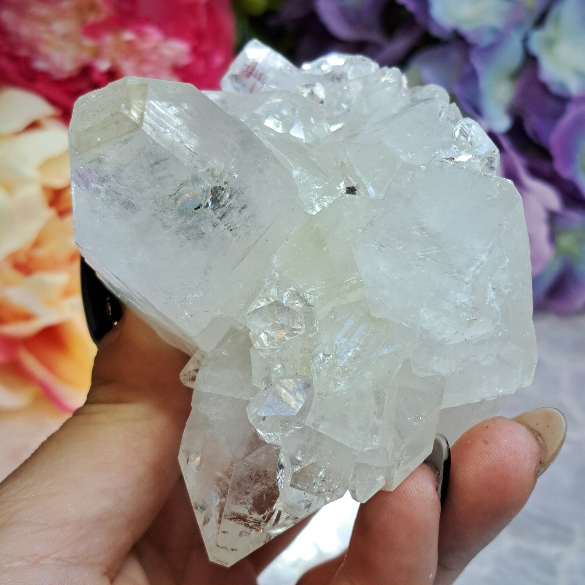 Dit prachtige spiegel apofyliet cluster met prachtige schitteringen, regenbogen en heel veel kleine kristallen komt uit Maharashtra India.