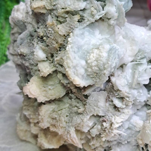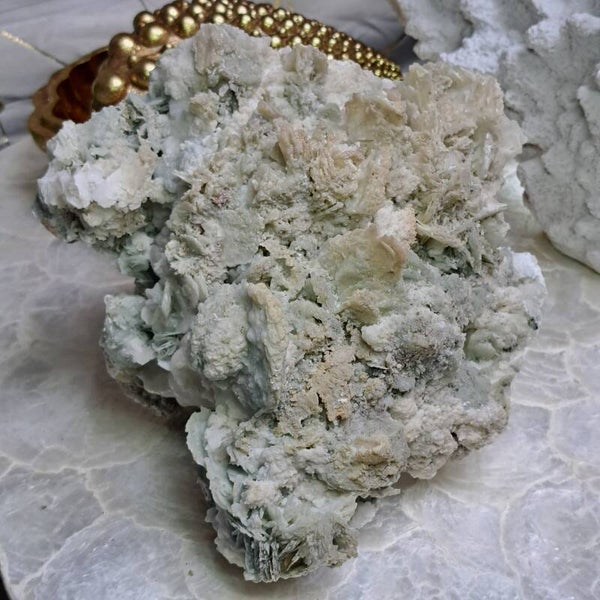 Dit prachtige, licht sparkly, cluster van Aragoniet met Calciet komt uit de Drujba Mijn in bulgarije. Ze is 2420 gram en 20x20 cm groot en licht UV reactief!