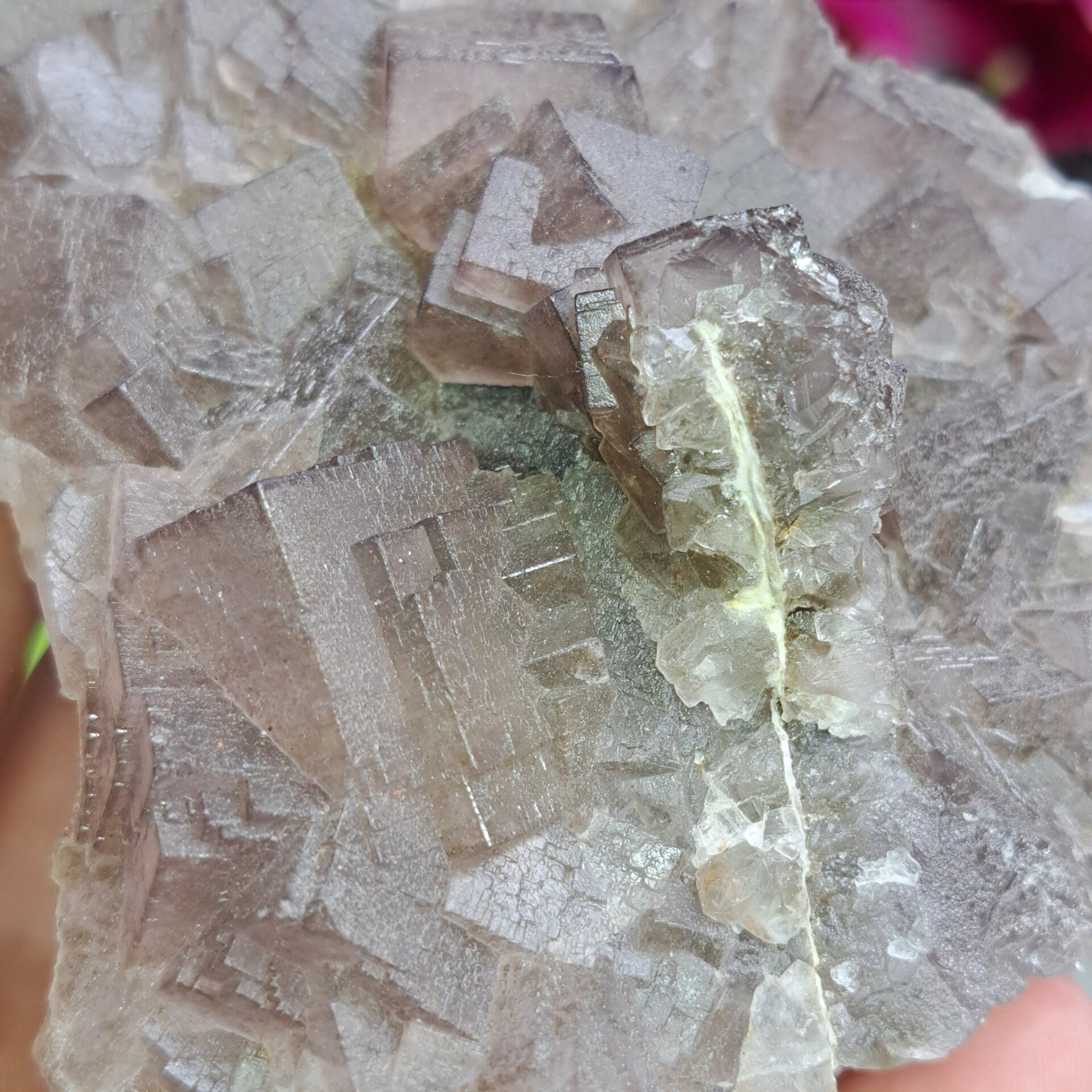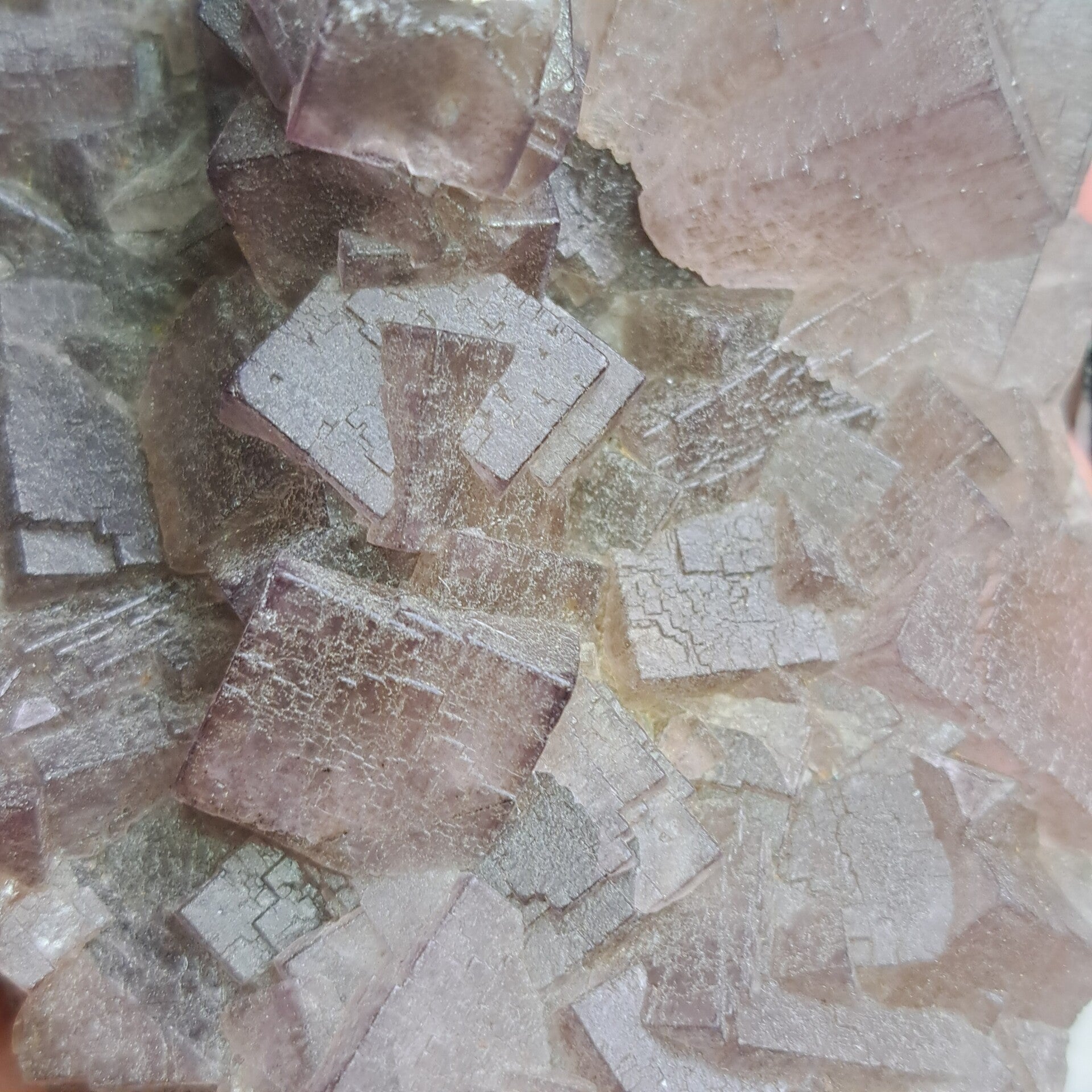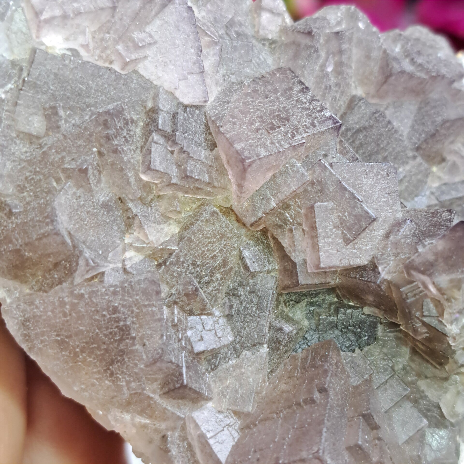 Deze vorm van fluoriet kenmerkt zich door de grijs paarsige kleur die onder UV licht dieppaars kleurt en voorzien is van prachtige groei, terminaties en in sommige gevallen ook ingesloten fantomen. Aan de onderzijde begroeid met dogtooth calciet kristallen.