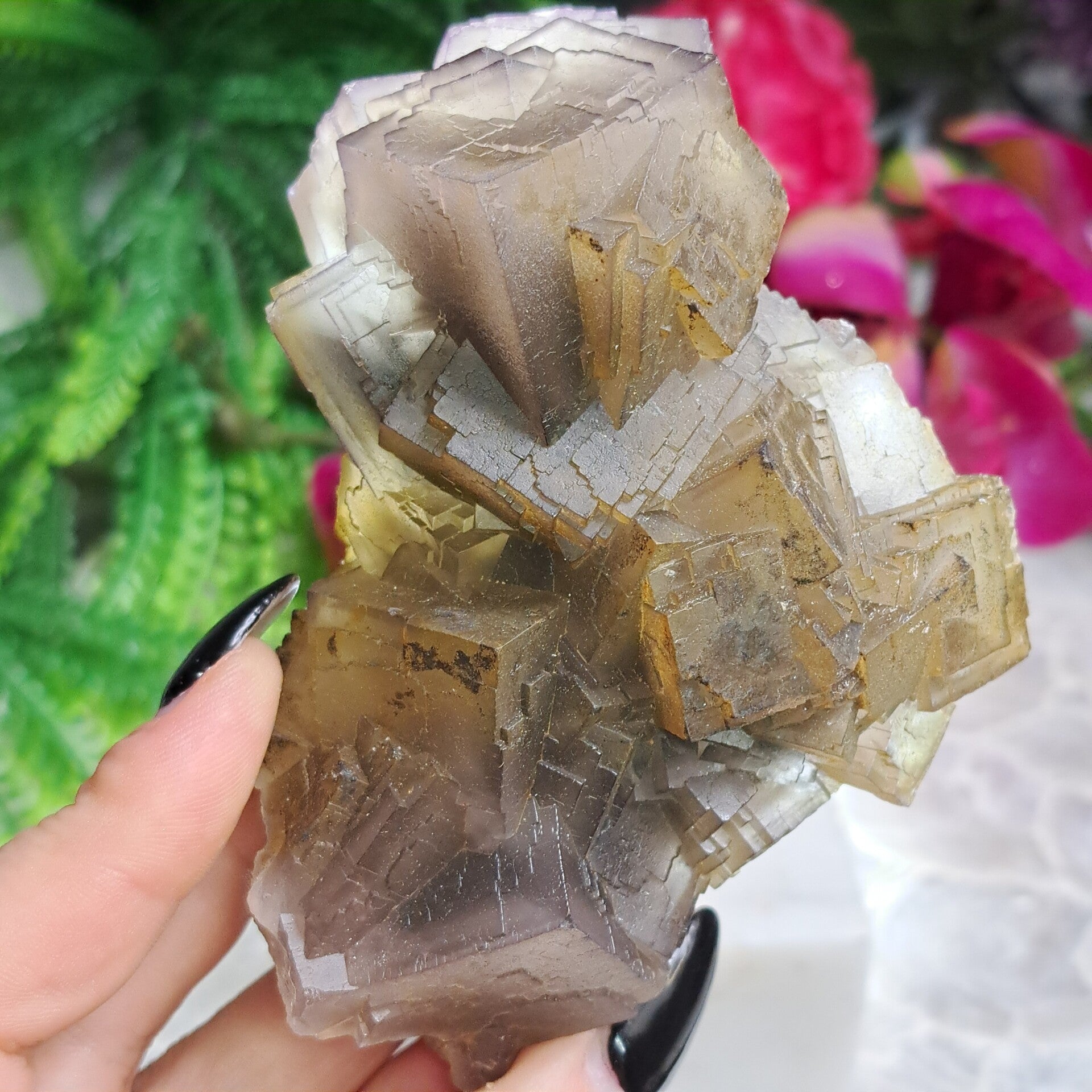 Deze vorm van fluoriet kenmerkt zich door de grijs paarsige kleur die onder UV licht dieppaars kleurt en voorzien is van prachtige groei, terminaties en in sommige gevallen ook ingesloten fantomen. Aan de onderzijde begroeid met dogtooth calciet kristallen.