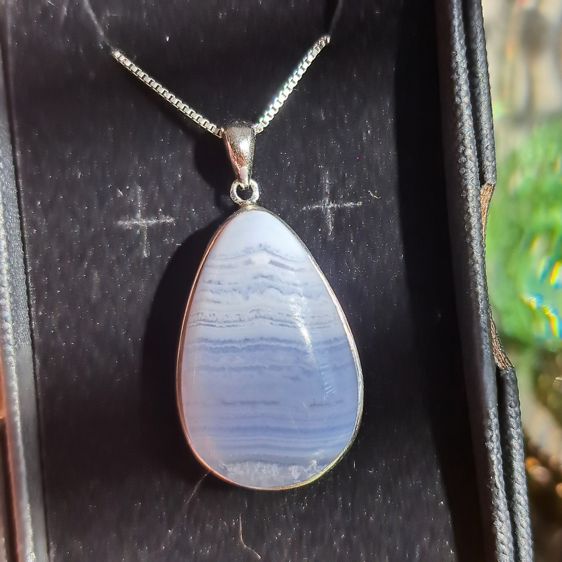 Blue Lace Agaat, eigenlijk beter bekend als Blauwe Chalcedoon staat bekend om haar beschermende en zachte werking.