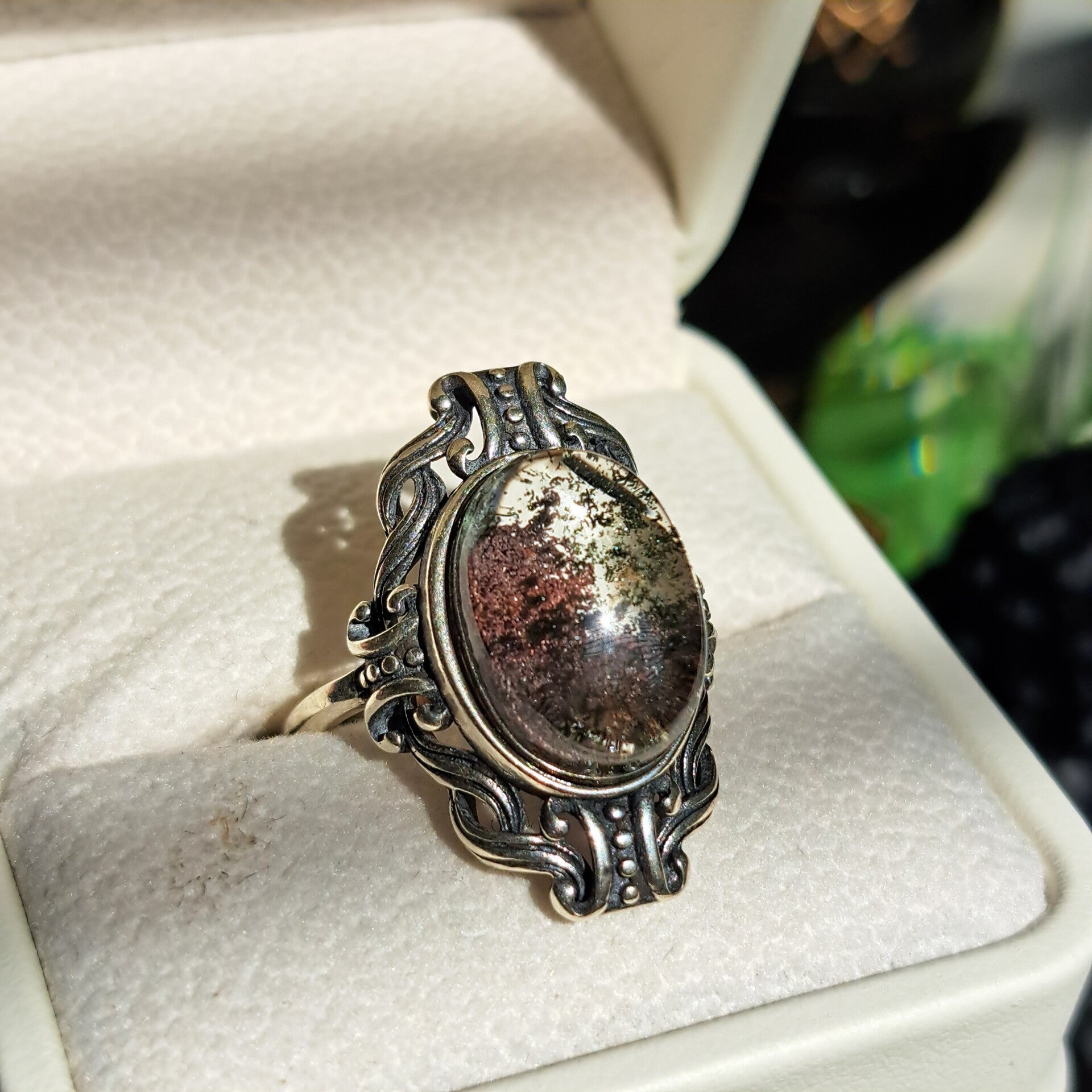 Deze gave S925 zilveren ring met een lodoliet mooie zandkleurige insluiting is verstelbaar van maat 17,5 tot maat 19.