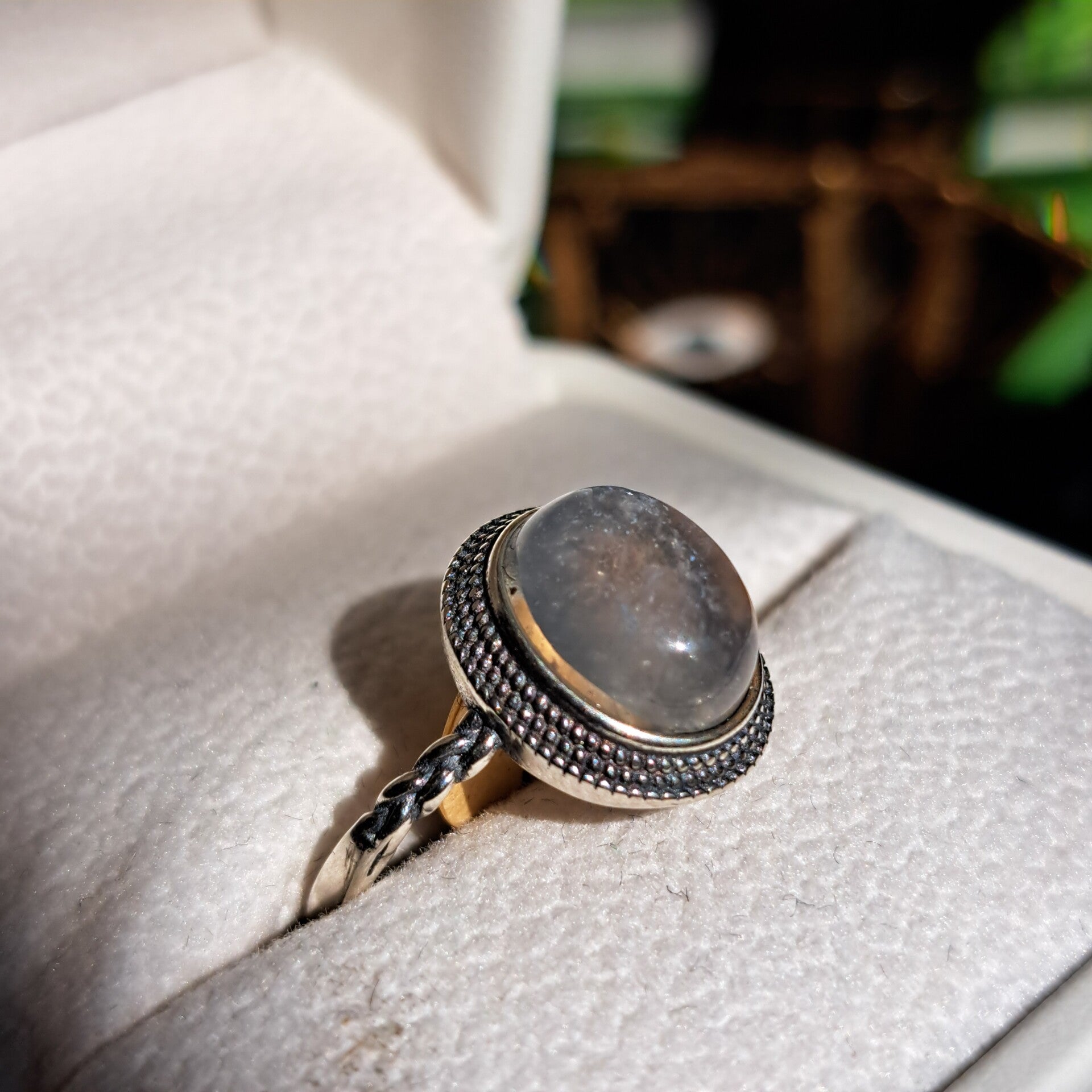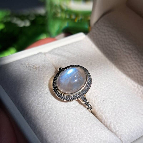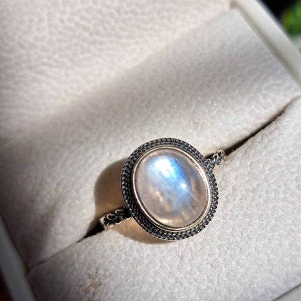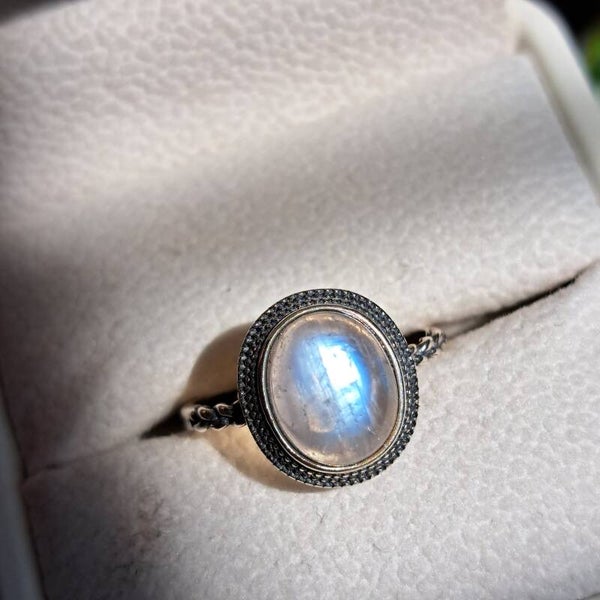 Deze gave ring van S925 zilver heeft een maansteen met blauwe flash en is verstelbaar en draagbaar van maat 16,5 tot maat 18.