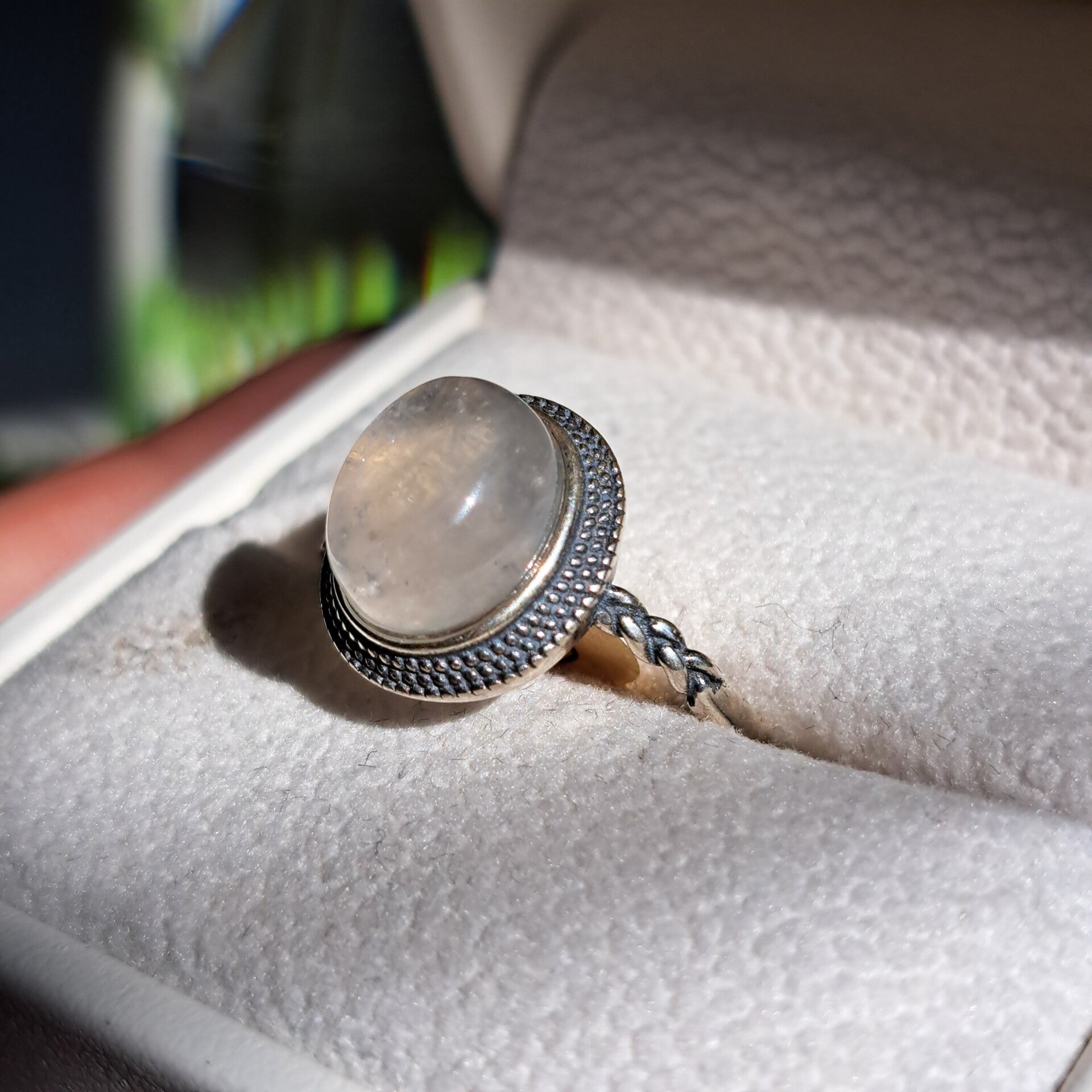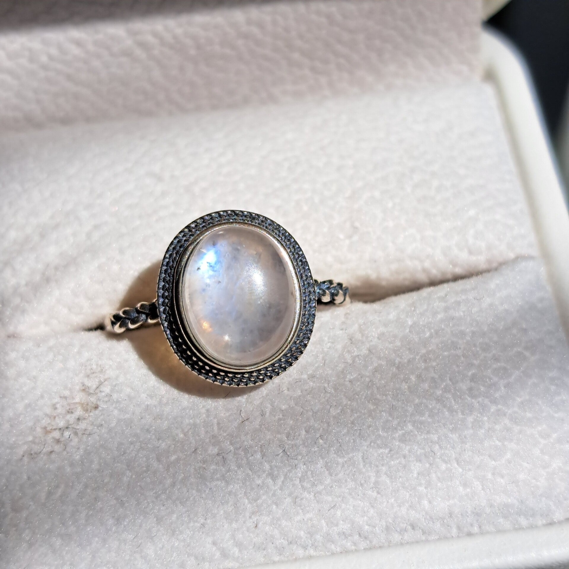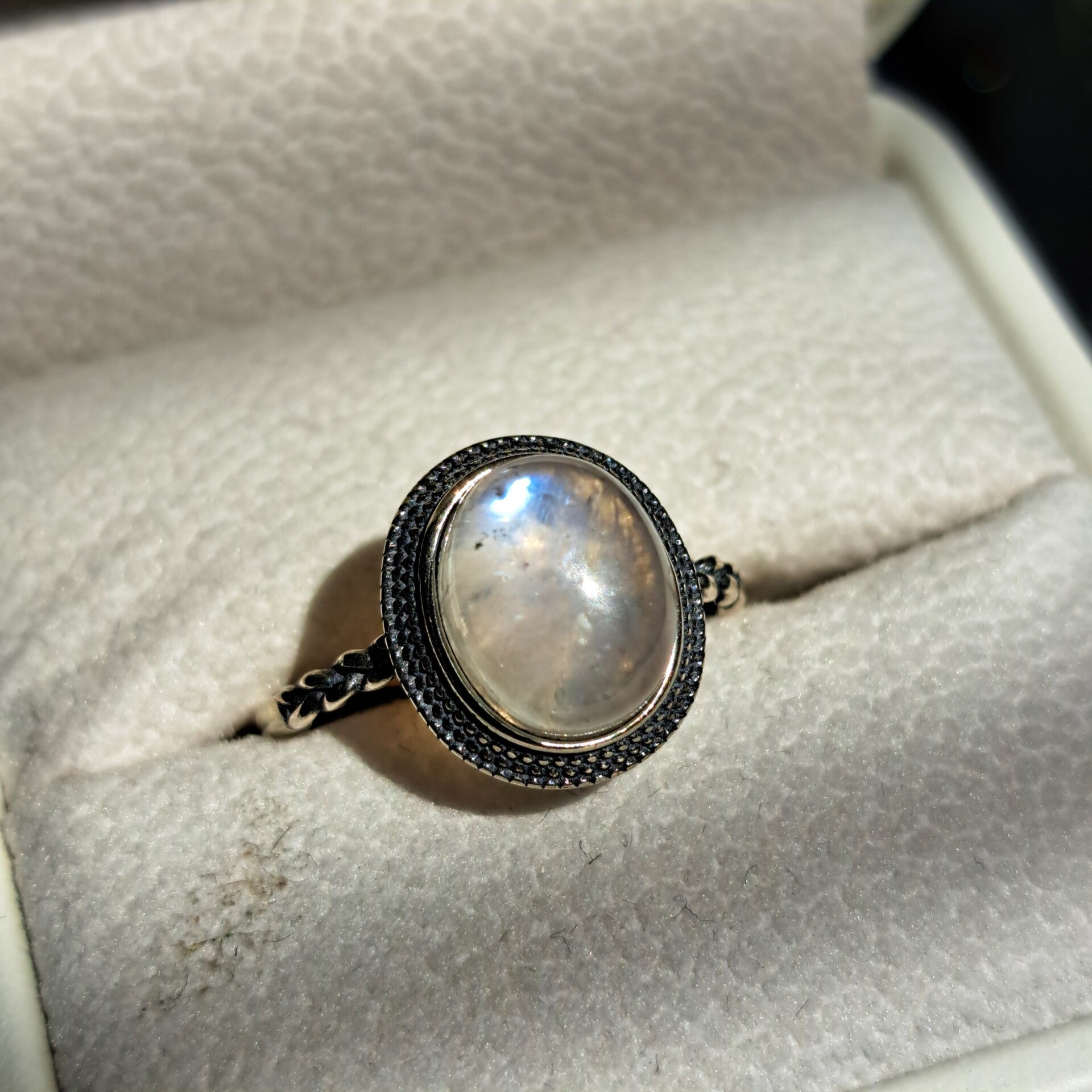 Deze gave ring van S925 zilver heeft een maansteen met blauwe flash en is verstelbaar en draagbaar van maat 16,5 tot maat 18.