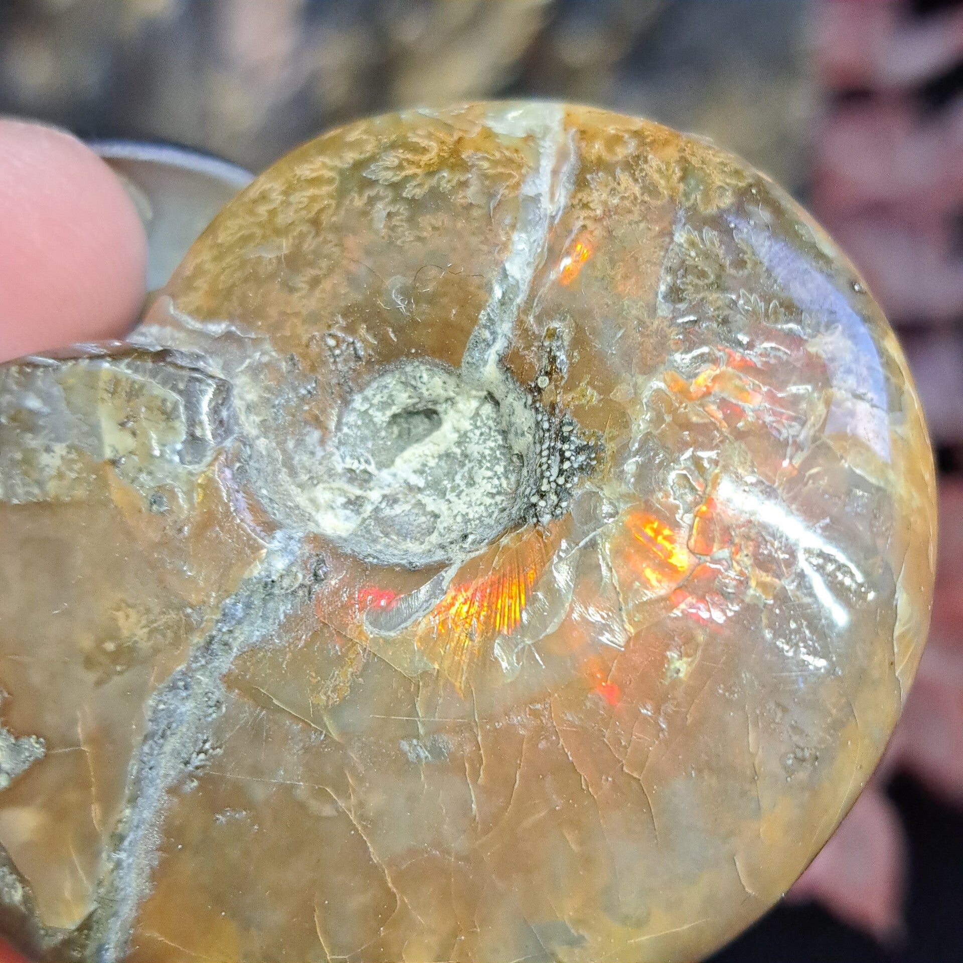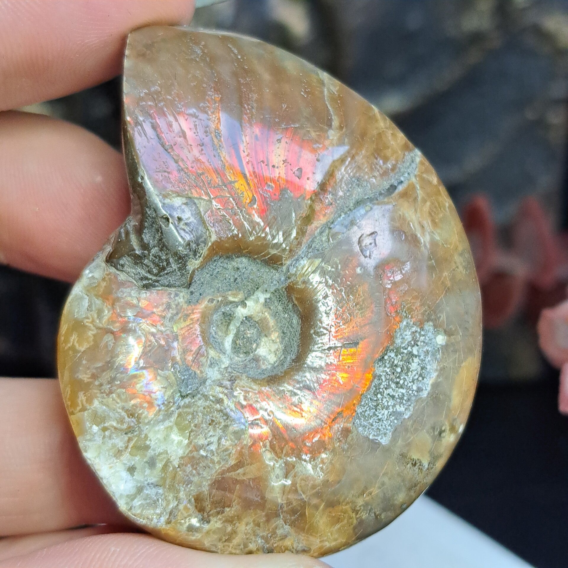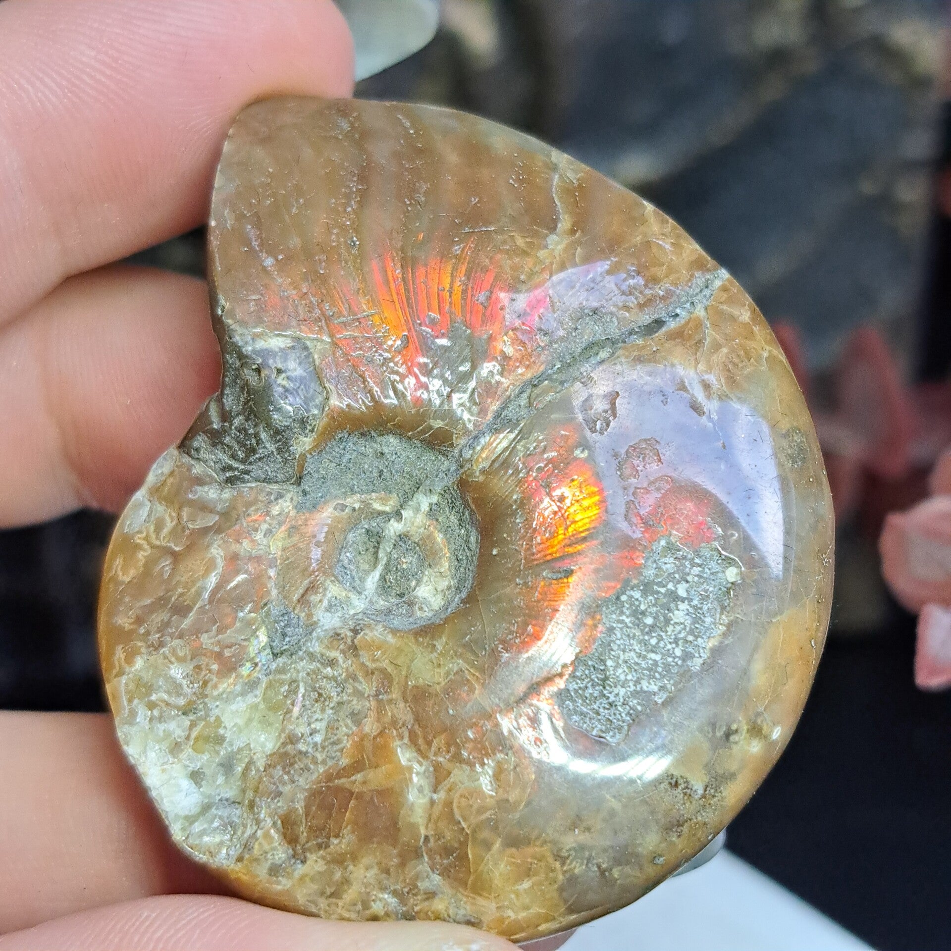 Deze prachtige ammoniet met iriscerende glans heeft vooral rood/oranje kleurstelling en is 6 cm groot.