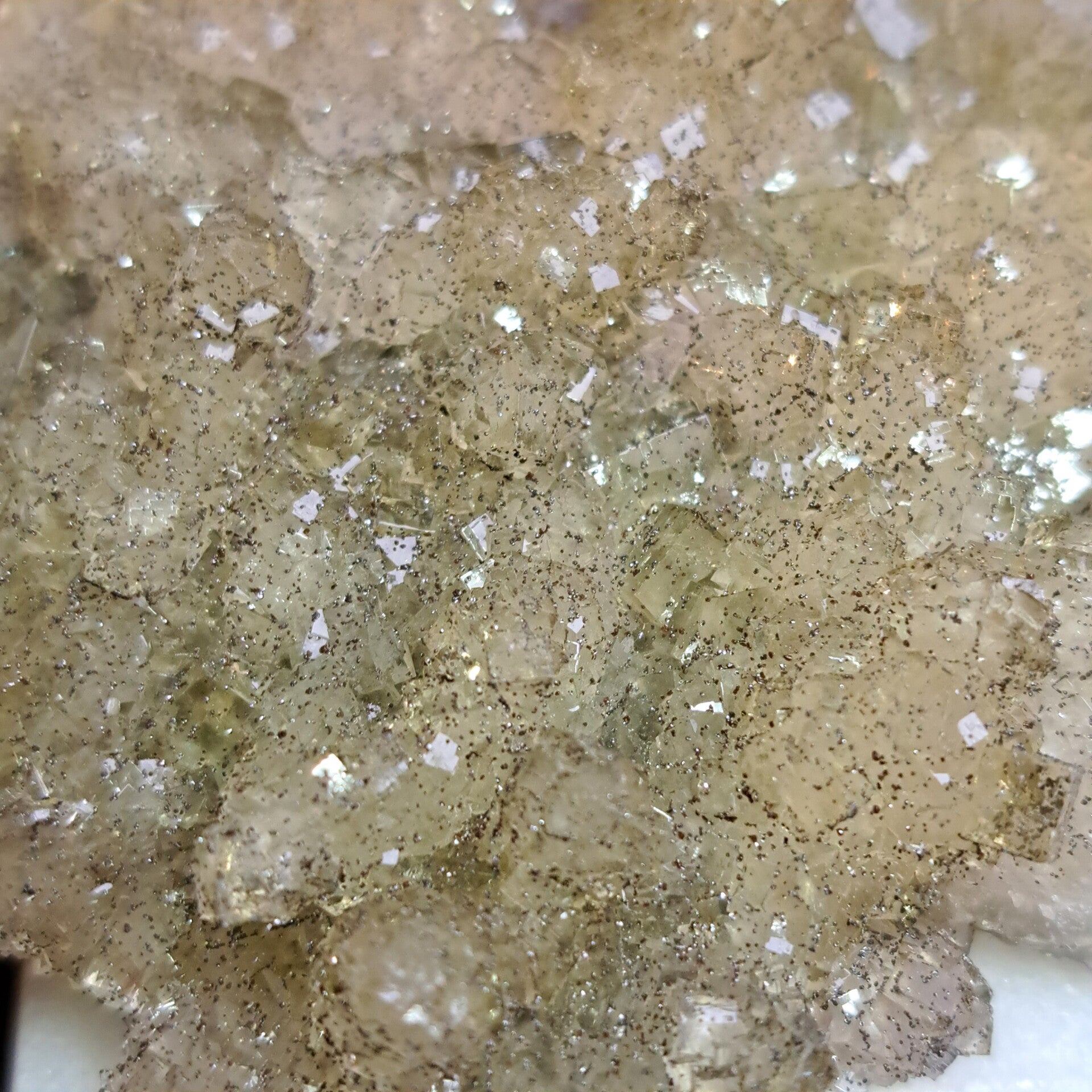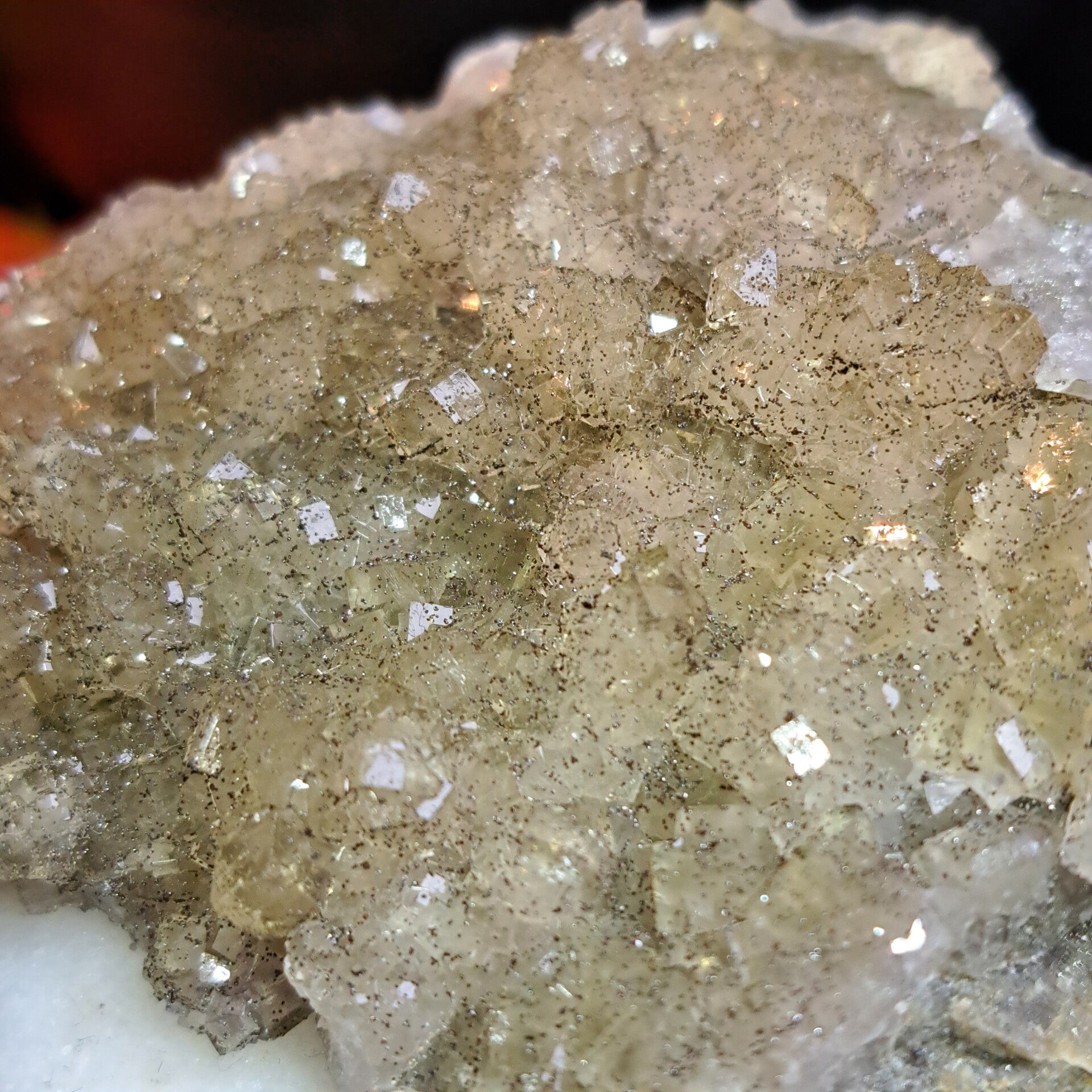 Deze prachtige diepgele fluorietkristalclusters met doorschijnende, kristallen (Onder korte golf UV fluorescerend met een vage witte kleur.) Sommige fluorietkristallen uit deze vindplaats vertonen prachtige fluorescerende fantomen binnen het kubusvormige kristal, afhankelijk van de onzuiverheden die tijdens de vorming aanwezig waren.