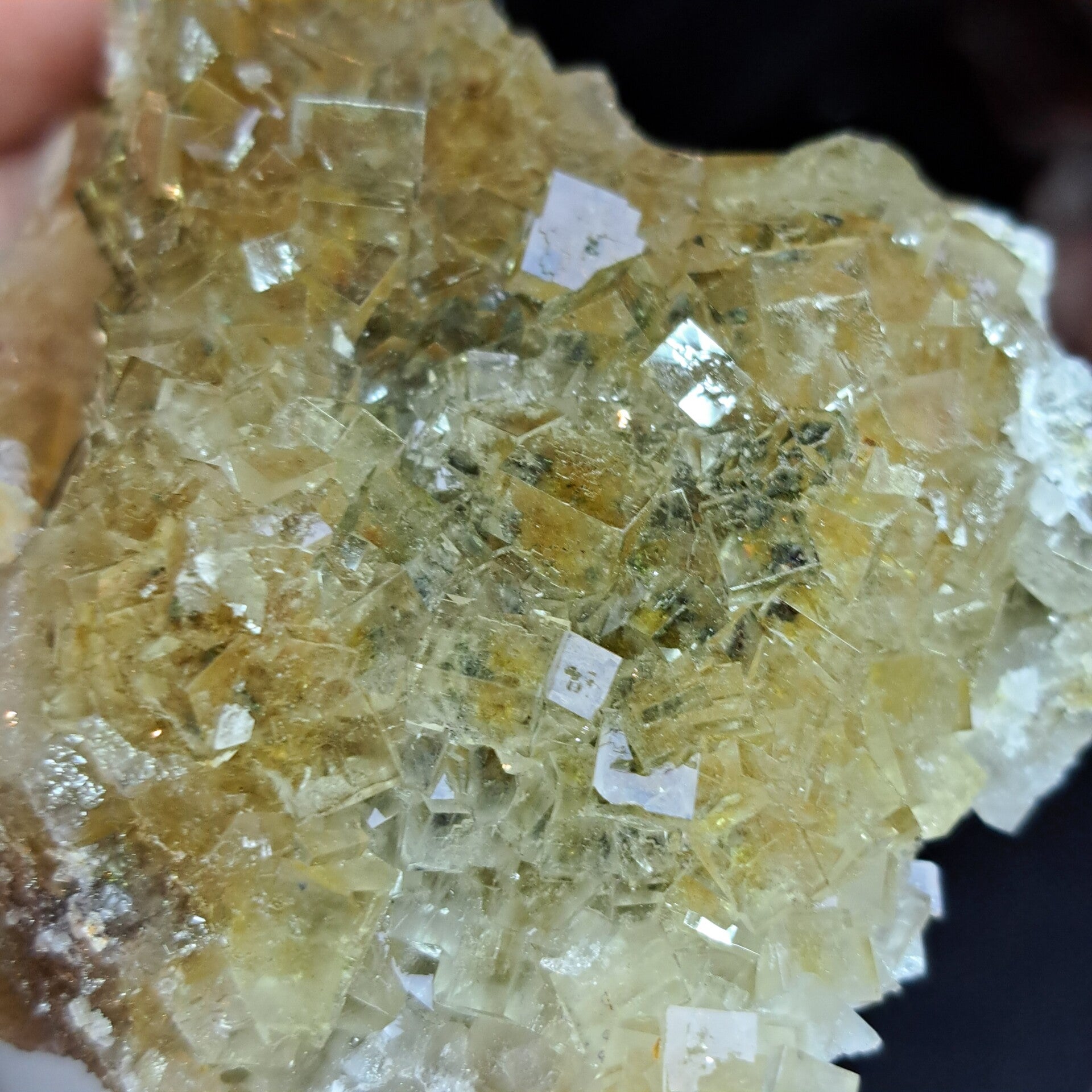 Deze prachtige diepgele fluorietkristalclusters met doorschijnende, kristallen (Onder korte golf UV fluorescerend met een vage witte kleur.) Sommige fluorietkristallen uit deze vindplaats vertonen prachtige fluorescerende fantomen binnen het kubusvormige kristal, afhankelijk van de onzuiverheden die tijdens de vorming aanwezig waren.