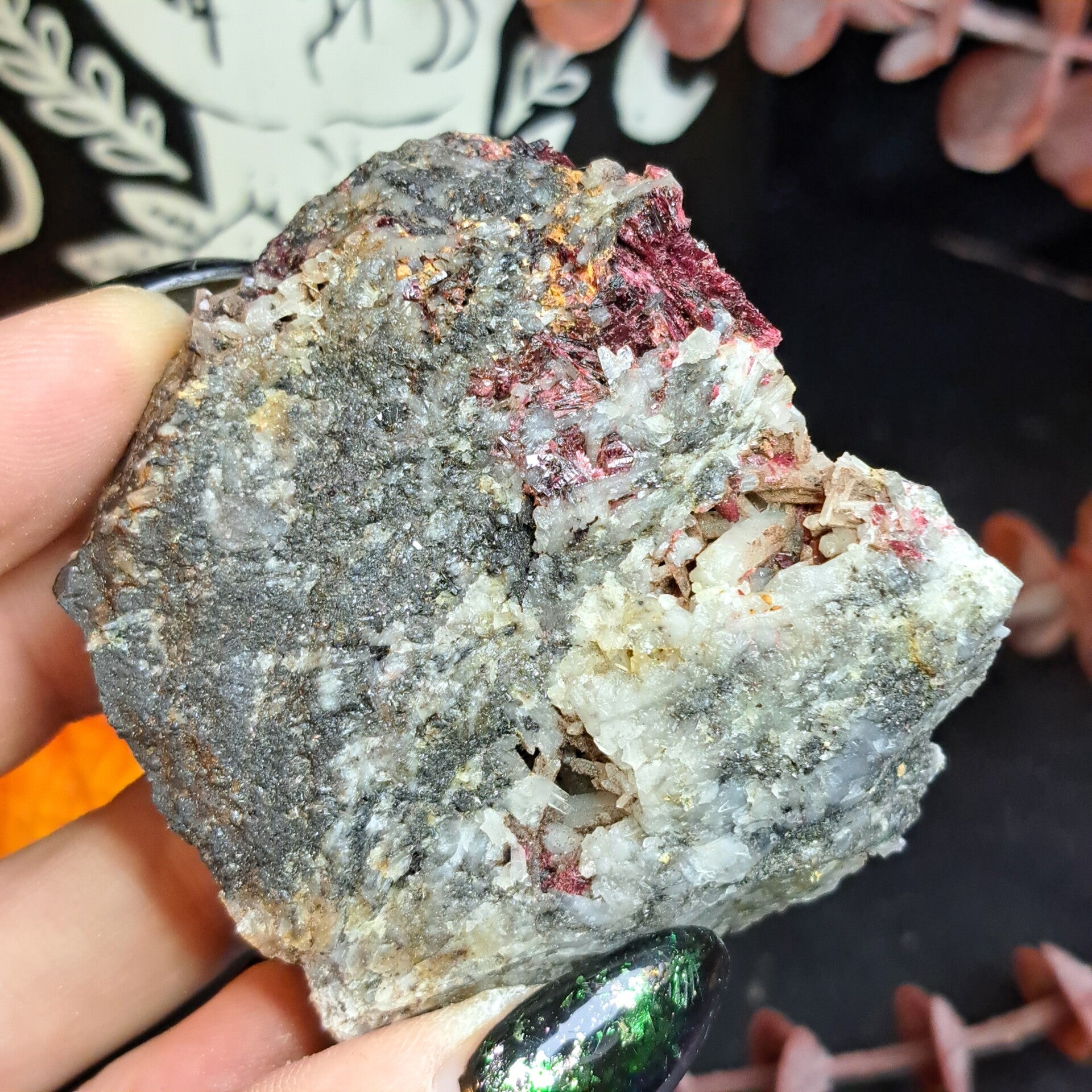 Erythriet is lid van de vivianiet familie en komt meestal voor in de buurt van andere Kobaltvariëteiten. Het kan ook geassocieerd worden met natuurlijk zilver. De kleur is voornamelijk karmozijnrood, maar kan ook paars, roze, perzik en grijs zijn. Een lichtere kleur Erythriet duidt meestal op een hoger nikkelgehalte. Dit mineraal werd voor het eerst ontdekt in Saxton, Duitsland in 1832 door François Sulpice Beaudant. Hij koos de naam naar het Griekse woord “Erythros”, wat “rood” betekent en de kleur was van het eerste exemplaar dat hij ontdekte. Hoewel het subtiele kleurverschil tussen Erithriet en Roseliet met het blote oog zichtbaar is (de Erythriet is donkerder en roder), heb je een loep nodig om hun structurele verschillen te zien (de Erythriet heeft beter gevormde, naaldachtige kristallen vergeleken met de meer drusy Roseliet.)