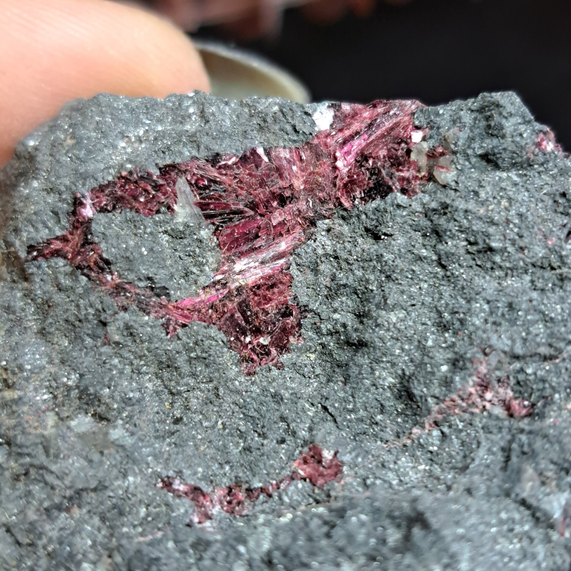 Erythriet is lid van de vivianiet familie en komt meestal voor in de buurt van andere Kobaltvariëteiten. Het kan ook geassocieerd worden met natuurlijk zilver. De kleur is voornamelijk karmozijnrood, maar kan ook paars, roze, perzik en grijs zijn. Een lichtere kleur Erythriet duidt meestal op een hoger nikkelgehalte. Dit mineraal werd voor het eerst ontdekt in Saxton, Duitsland in 1832 door François Sulpice Beaudant. Hij koos de naam naar het Griekse woord “Erythros”, wat “rood” betekent en de kleur was van het eerste exemplaar dat hij ontdekte. Hoewel het subtiele kleurverschil tussen Erithriet en Roseliet met het blote oog zichtbaar is (de Erythriet is donkerder en roder), heb je een loep nodig om hun structurele verschillen te zien (de Erythriet heeft beter gevormde, naaldachtige kristallen vergeleken met de meer drusy Roseliet.)