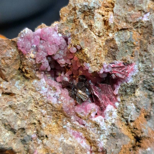 Erythriet is lid van de vivianiet familie en komt meestal voor in de buurt van andere Kobaltvariëteiten. Het kan ook geassocieerd worden met natuurlijk zilver. De kleur is voornamelijk karmozijnrood, maar kan ook paars, roze, perzik en grijs zijn. Een lichtere kleur Erythriet duidt meestal op een hoger nikkelgehalte. Dit mineraal werd voor het eerst ontdekt in Saxton, Duitsland in 1832 door François Sulpice Beaudant. Hij koos de naam naar het Griekse woord “Erythros”, wat “rood” betekent en de kleur was van het eerste exemplaar dat hij ontdekte. Hoewel het subtiele kleurverschil tussen Erithriet en Roseliet met het blote oog zichtbaar is (de Erythriet is donkerder en roder), heb je een loep nodig om hun structurele verschillen te zien (de Erythriet heeft beter gevormde, naaldachtige kristallen vergeleken met de meer drusy Roseliet.)