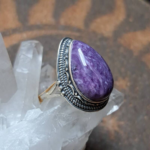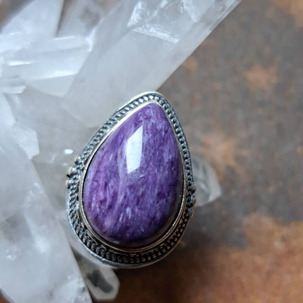 Charoiet staat symbool voor ontdekking van je spirituele zielspad. Het is een combinatie van verschillende mineralen en is een gehydrateerd kalium- calcium sillicaat. Charoiet is een vezelig mineraal en de kleur kan variëren van licht- tot donkerviolet, soms blauwviolet, met gouden, lichtbruine, donkergroene, grijze of zwarte insluitsels.