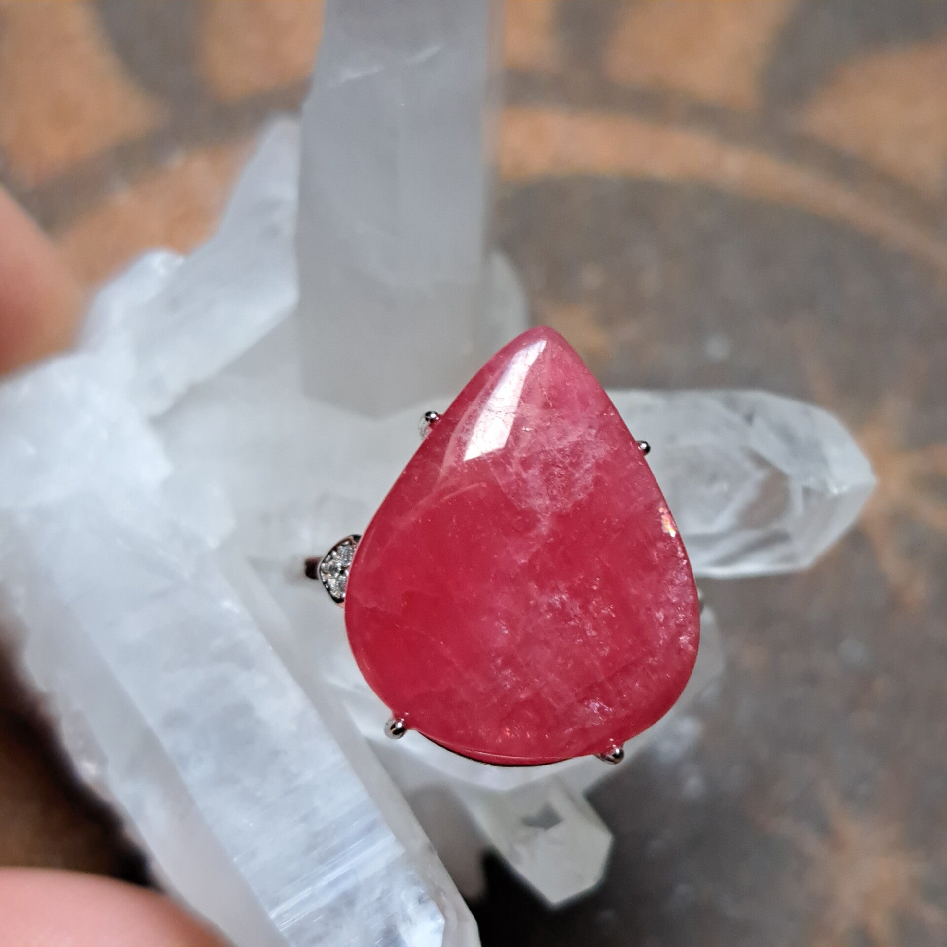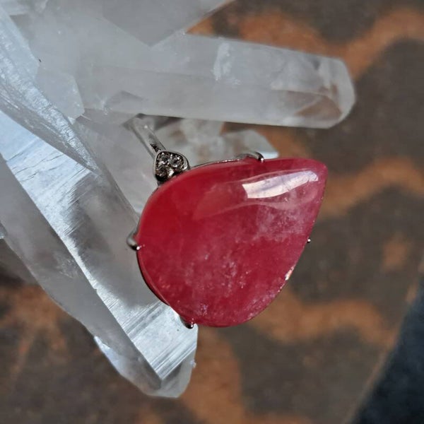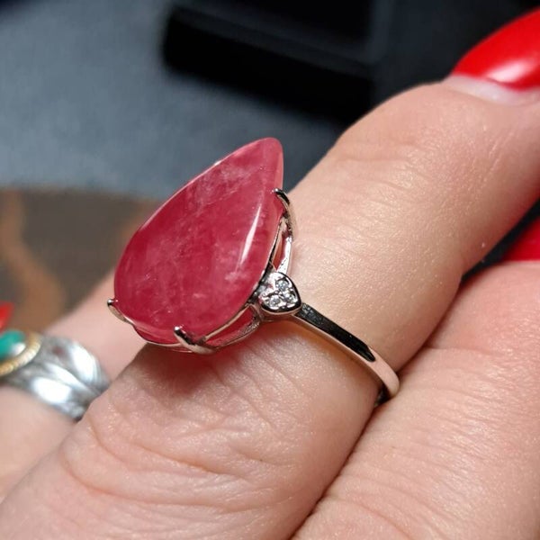 Deze mooie dieproze Gem variant is gezet in een verstelbare zilveren ring met daarnaast een aantal zirkonia's aan beide kanten en is draagbaar van maat 17,5 tot maat 18,5.