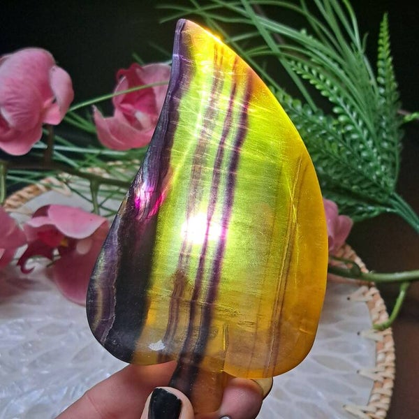 Dit toffe schaaltje van geel met paarse fluoriet is geslepen in de vorm van een blad is 279 gram en 14 cm groot.