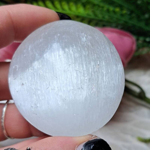Deze mooie palmsteen van satijnspaat (Seleniet) is 5,7 cm groot.