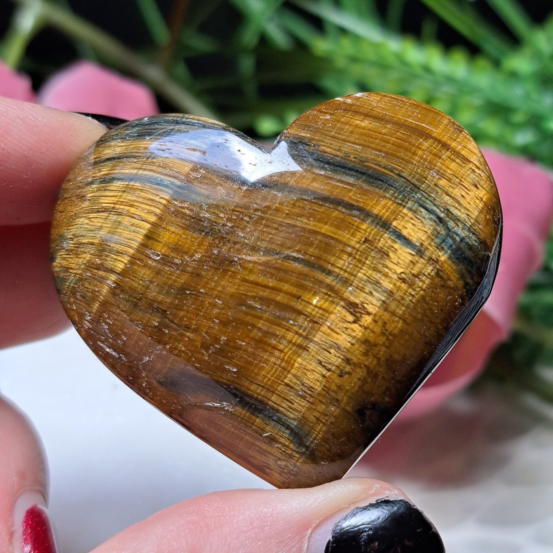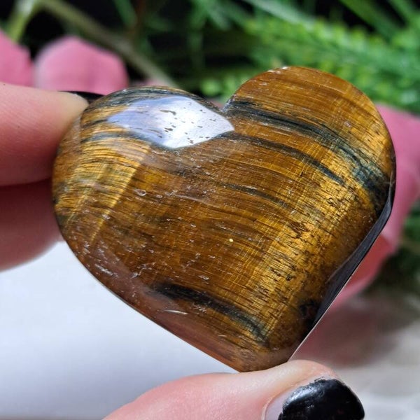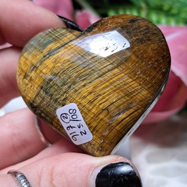 Dit toffe hart met prachtige chattoyance/flash is 80 gram en 5,2 cm groot en heeft opzij een klein beetje ingeloten valkenoog