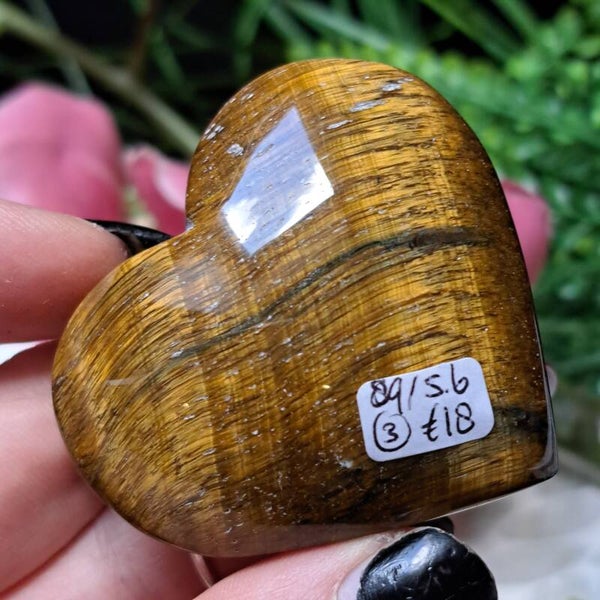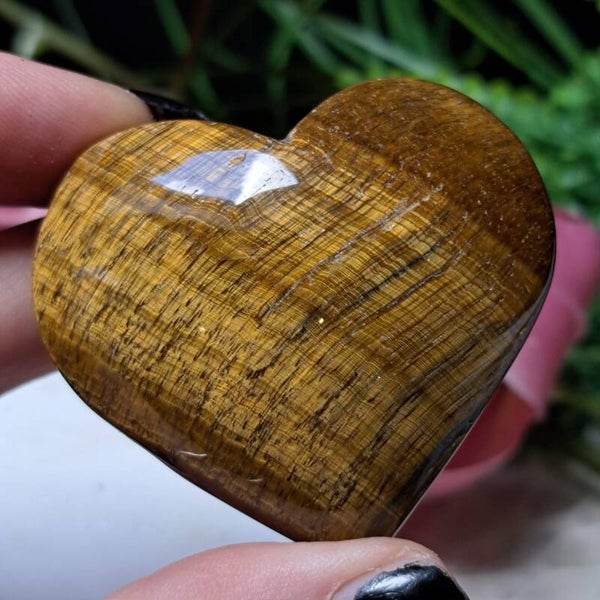Dit toffe hart met prachtige chattoyance/flash is 89 gram en 5,6 cm groot en heeft opzij een klein beetje ingeloten valkenoog