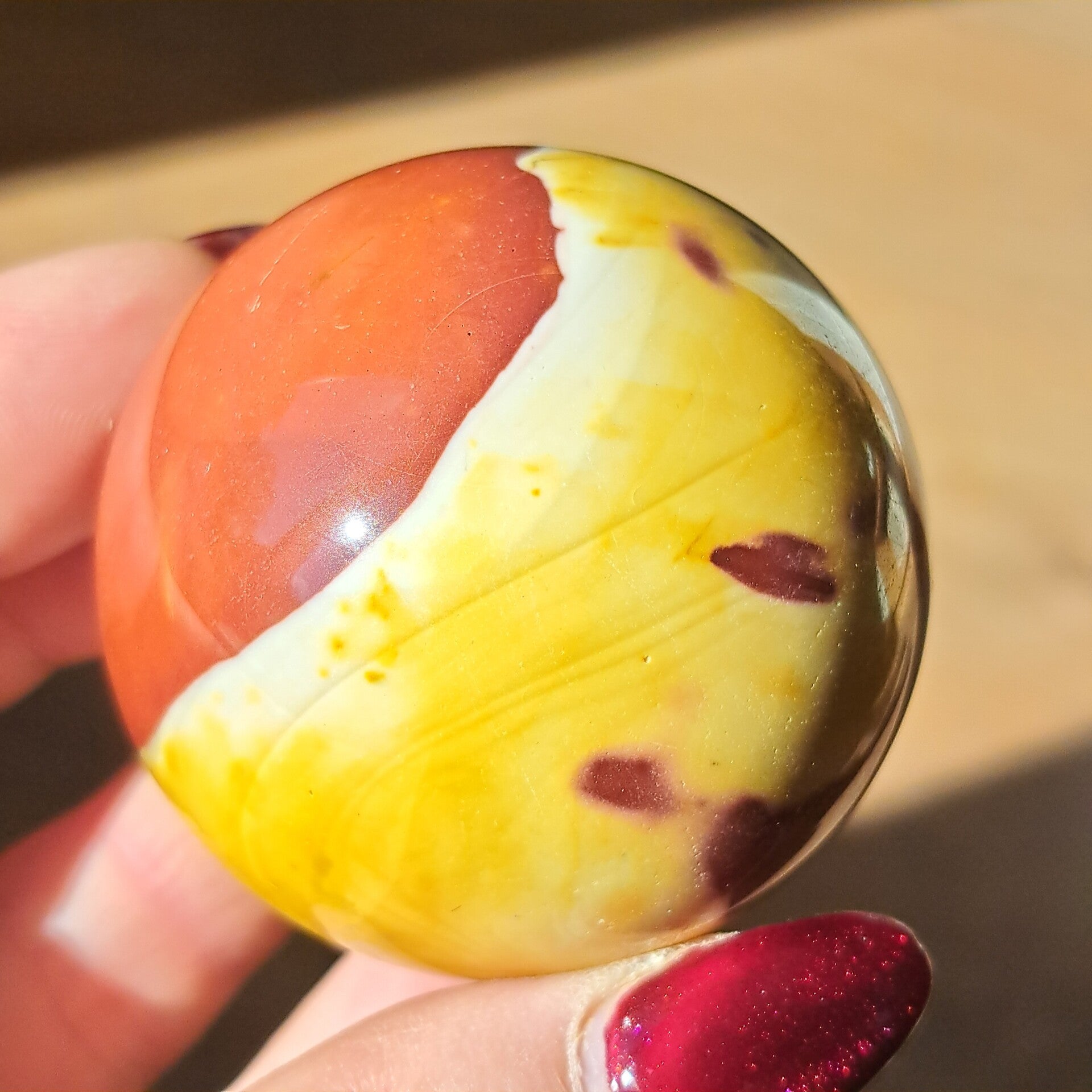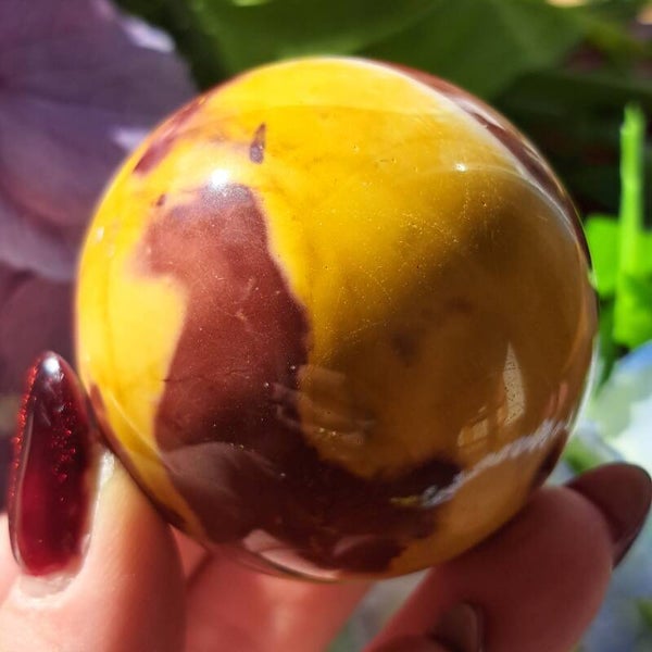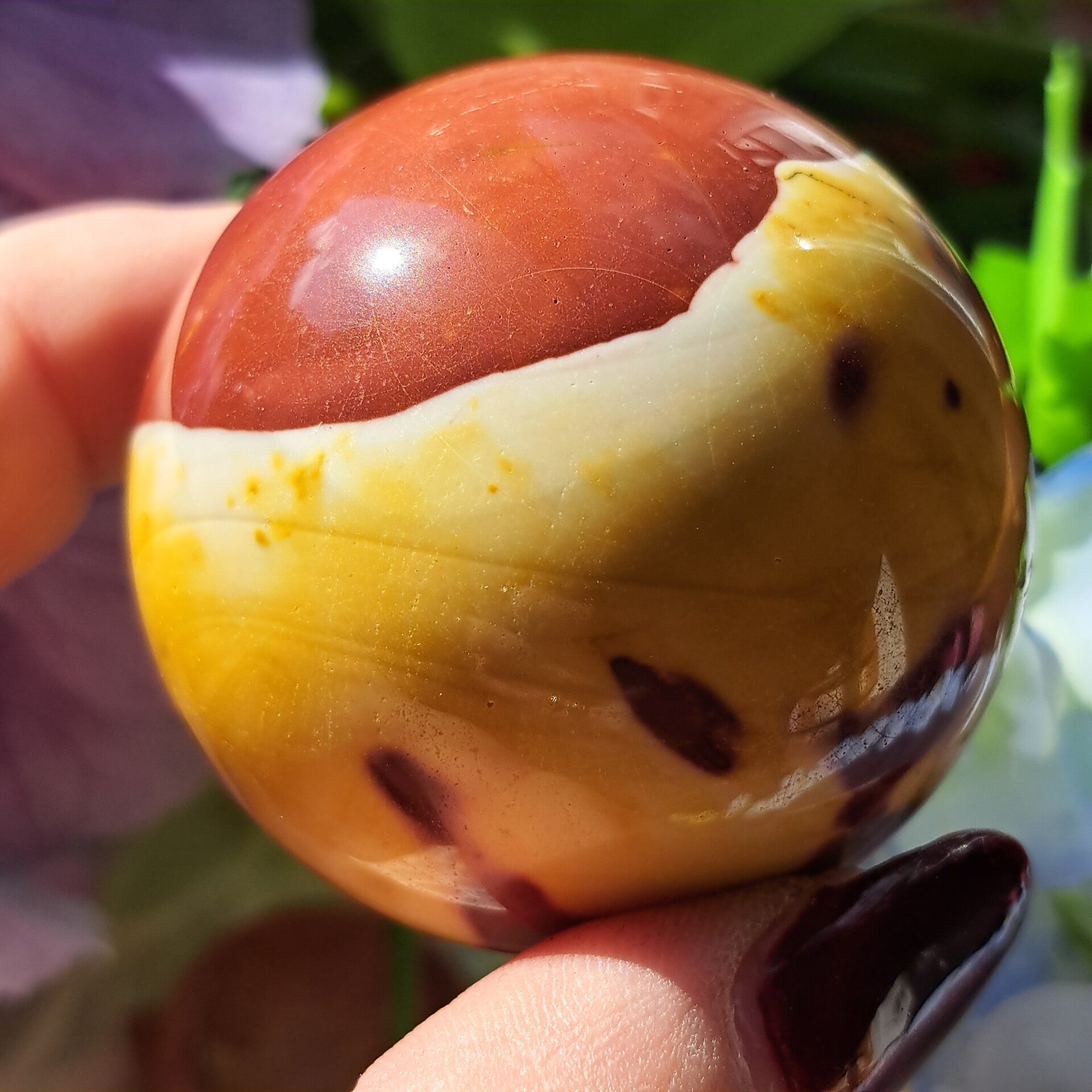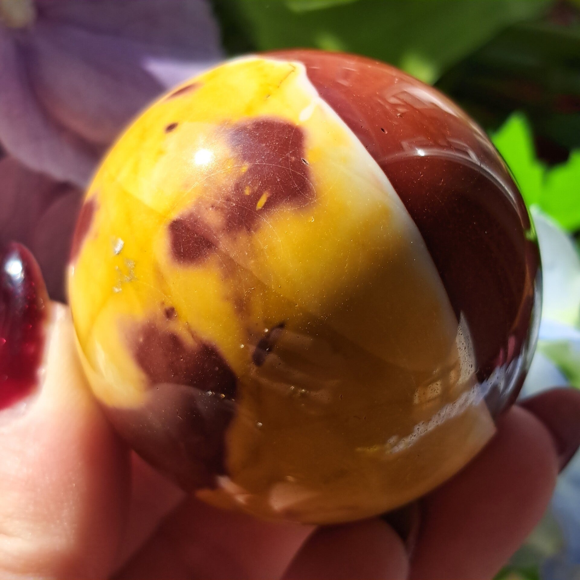 Mookaiet is een sterk aardendende en verwarmende steen met aparte marmering van de kleuren geel, wit, rood en soms zelfs paars.