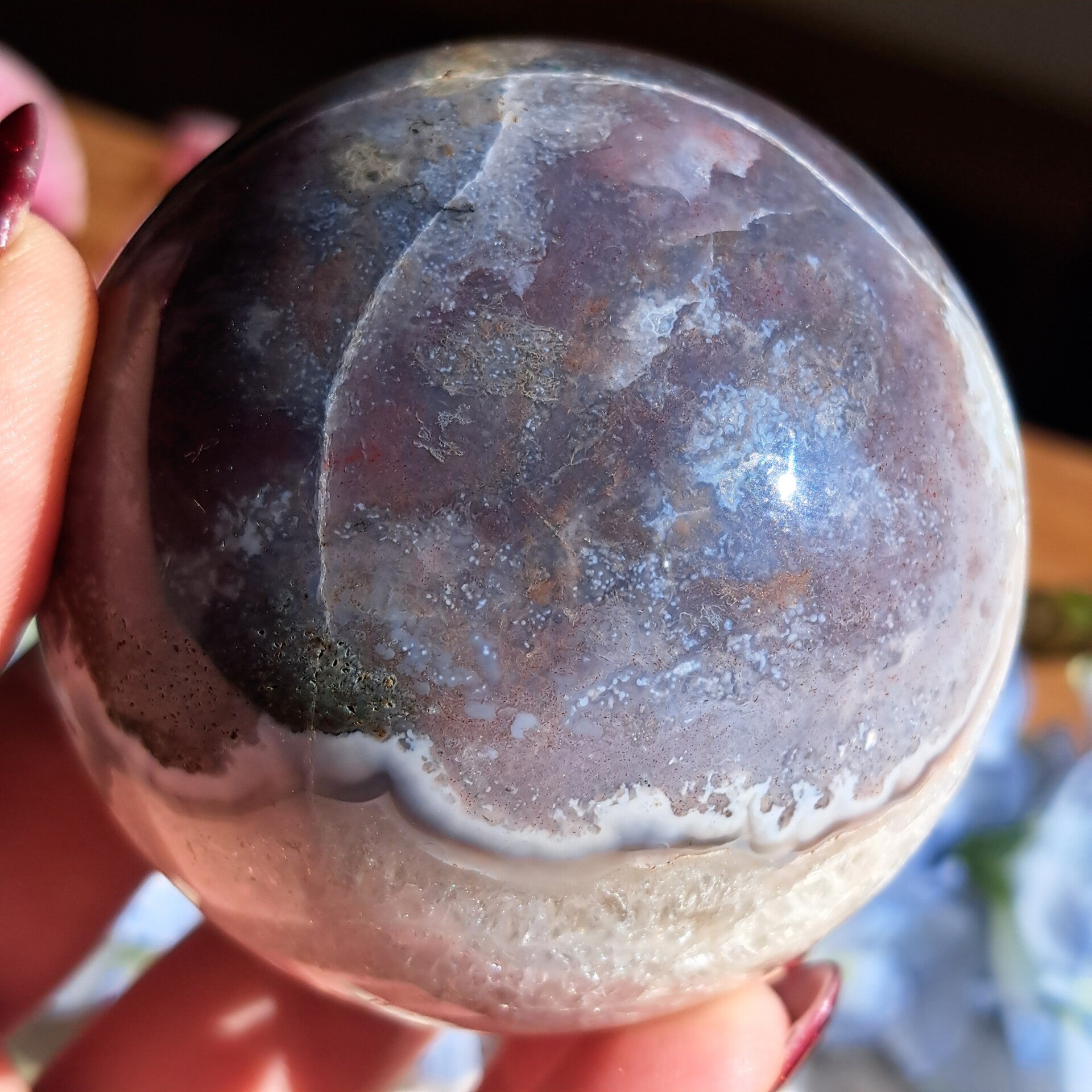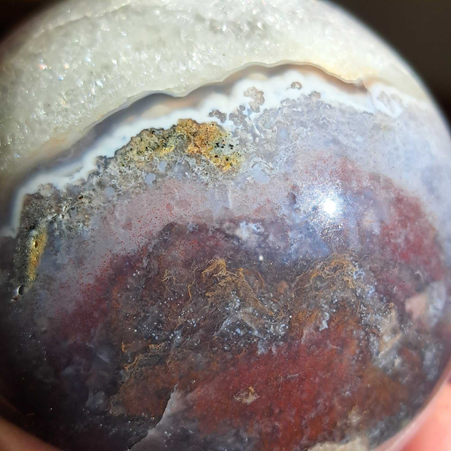 Deze toffe bol met rode en groene mosagaat in combinatie met kwarts heeft wel wat weg van een oceaanjaspis qua kleurstelling!