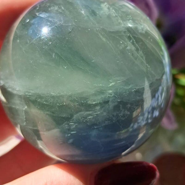 Deze Fluoriet bol van groen/blauwe Fluoriet straalt fel blauw onder UV en is 278 gram en 5,5 cm groot.