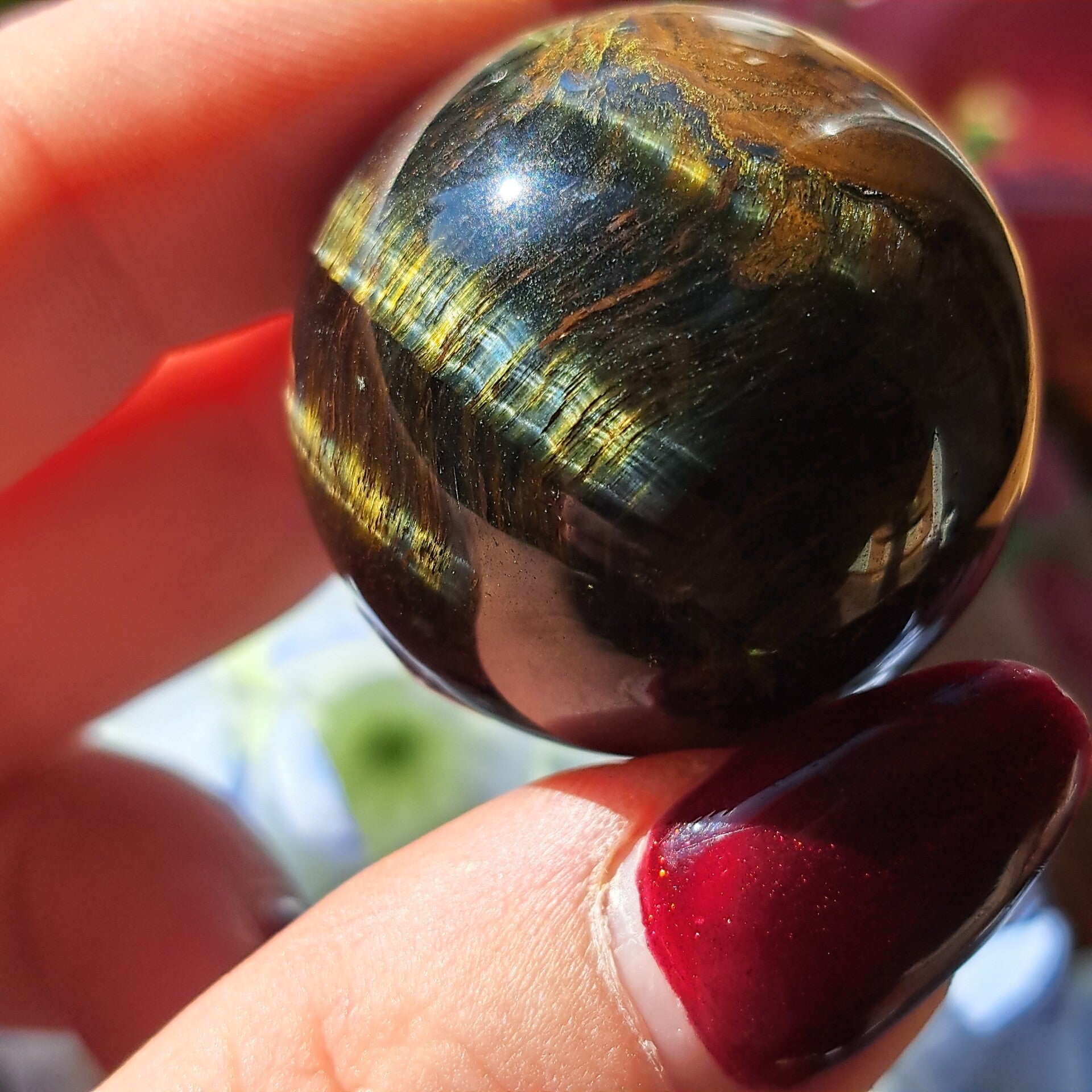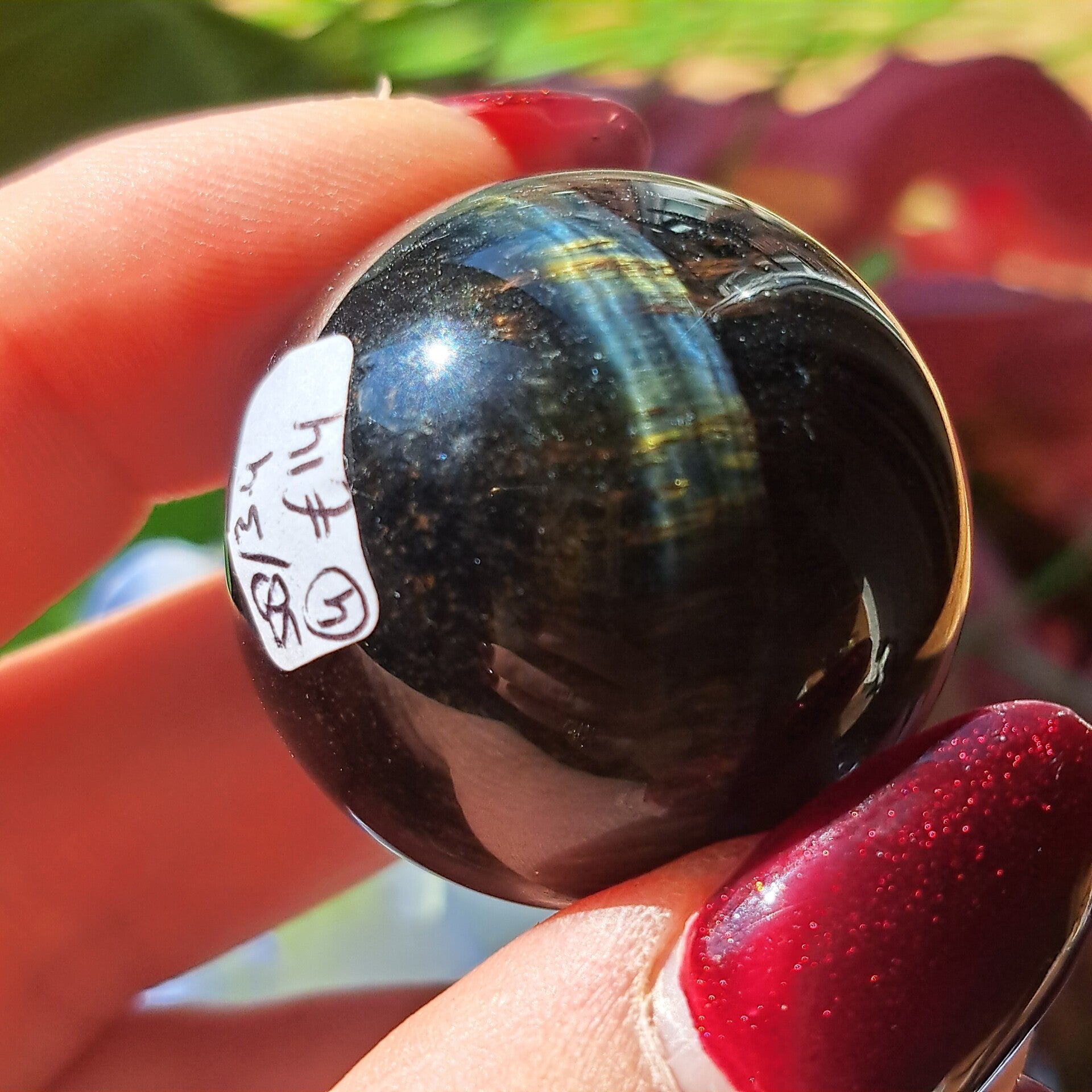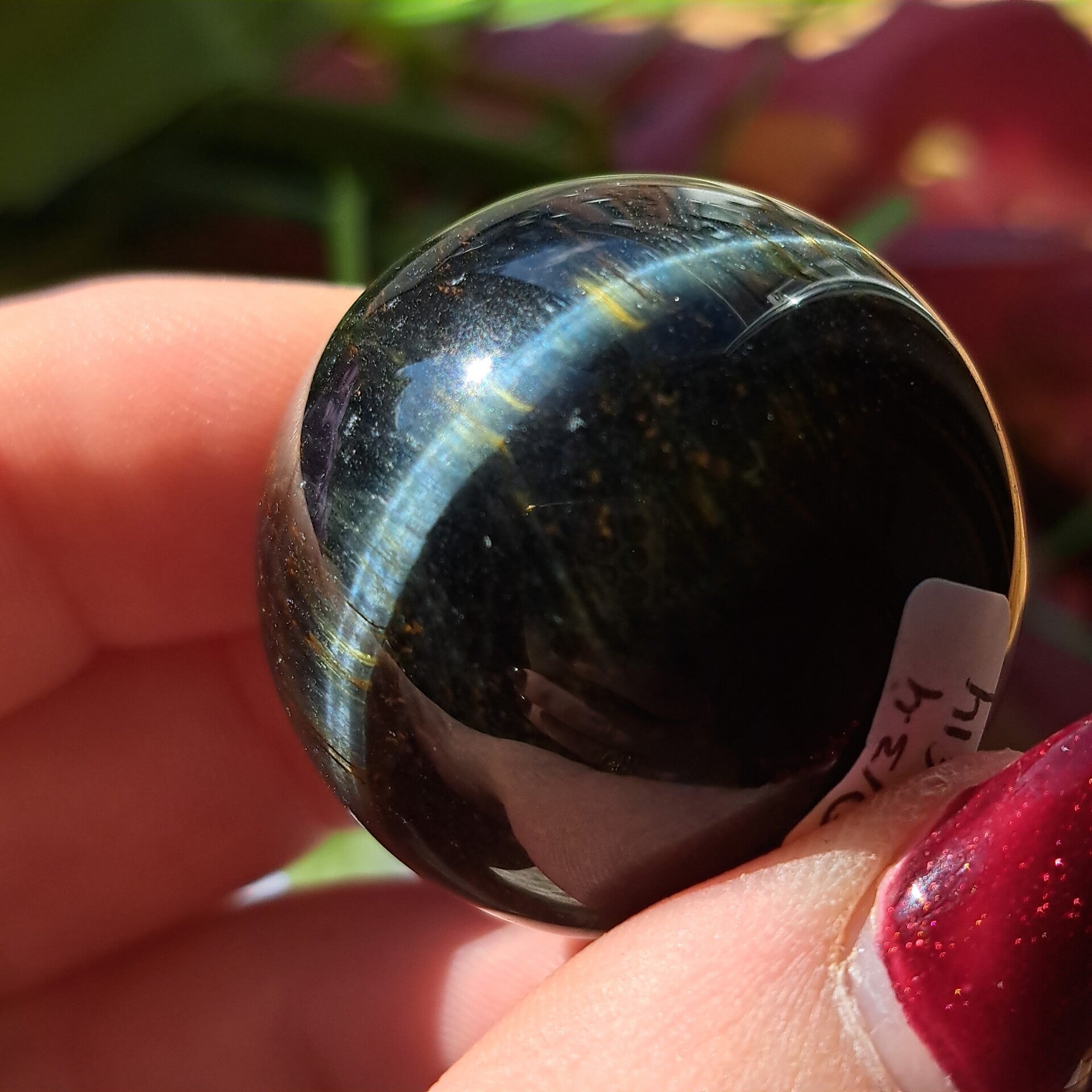 Deze toffe bol met de typische chattoyance / flash is 3,4 cm groot en weegt 58 gram.
