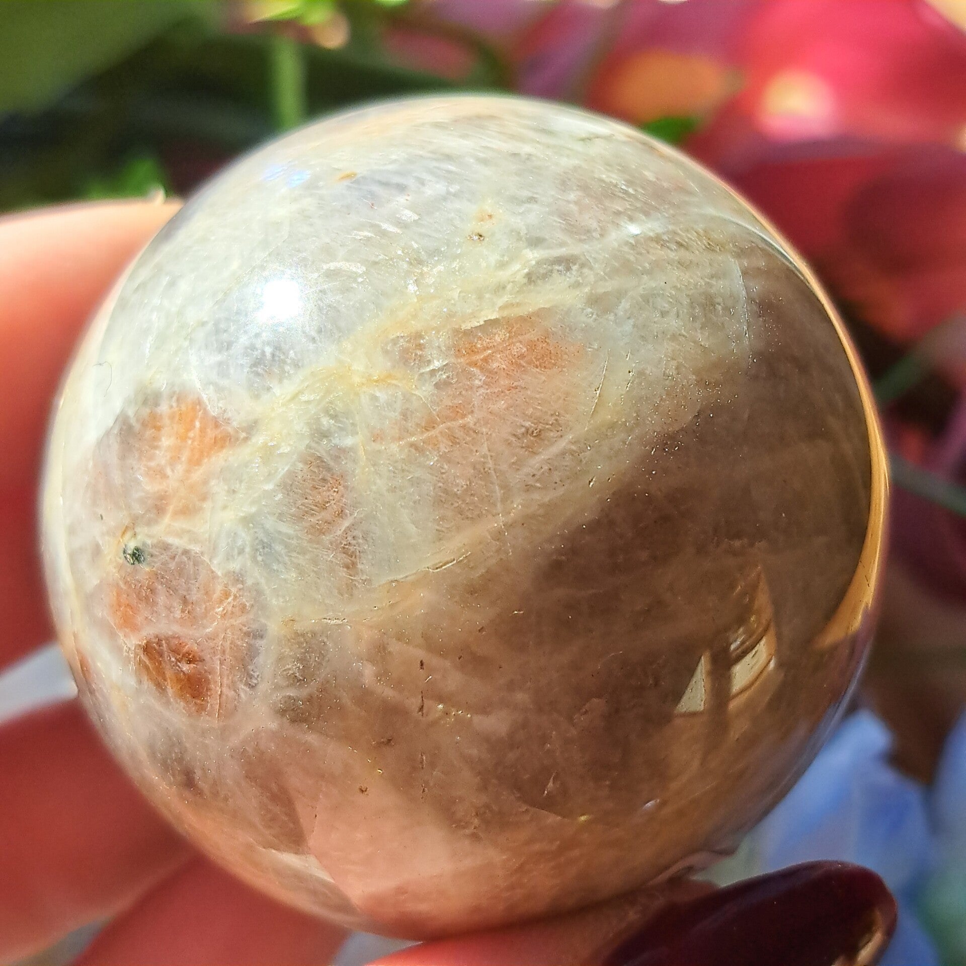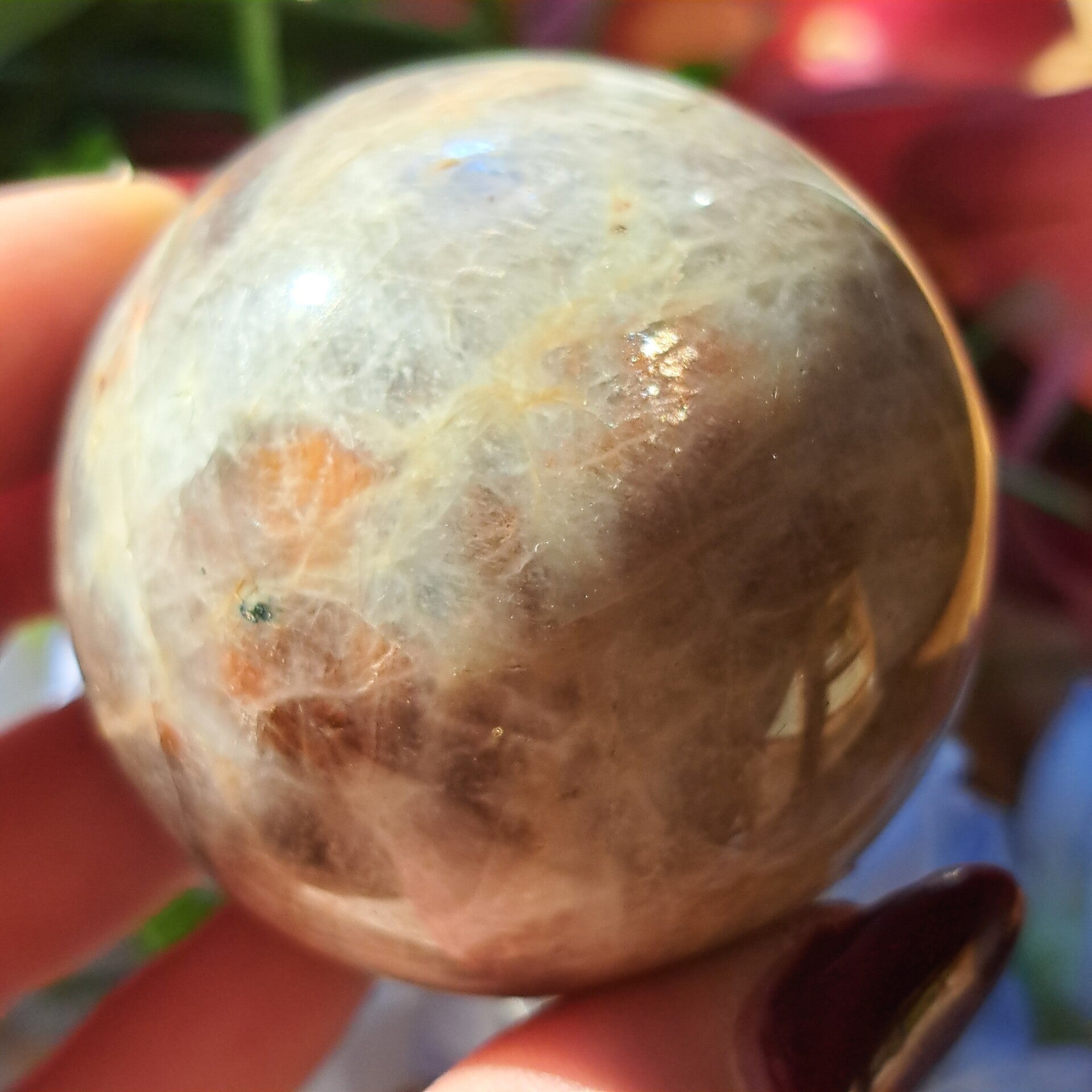 Deze gave maansteen bol met blauwe flash en beetje zonnesteenflash is 5,1 cm groot en weegt 215 gram.