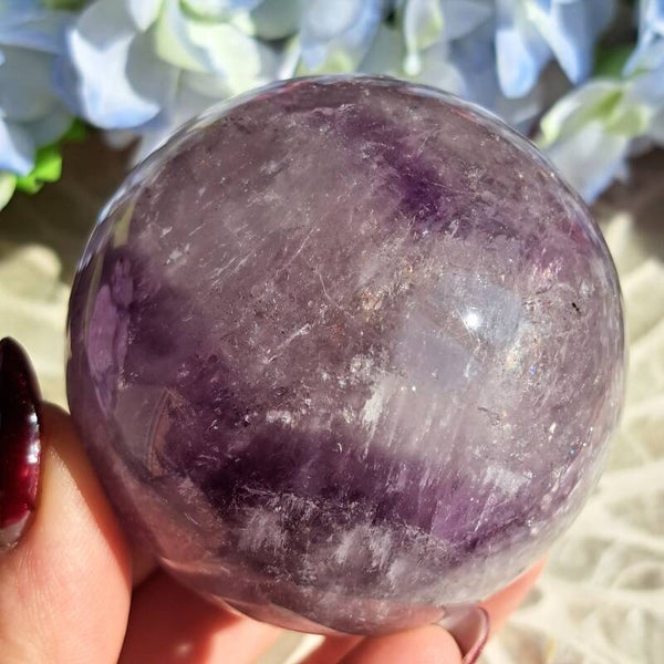 Deze toffe transparante bol met gaaf paars "trapeche" lijnenspel is 397 gram en 6,7 cm groot.