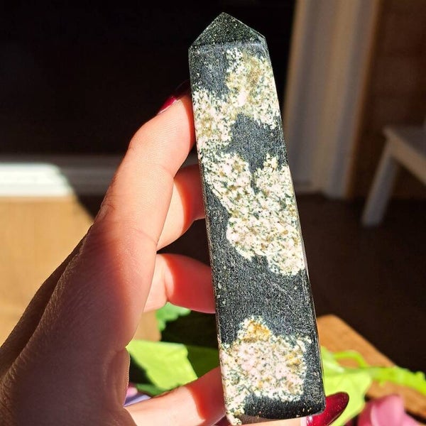 Deze wat minder bekende vorm van Rhodoniet (Zagi Mountains Pakistan) wordt ook wel Sneeuwvlok Rhodoniet genoemd en eigenlijk is het donkere mangaan waar roze Sneeuwvlokken van Rhodoniet in zitten.