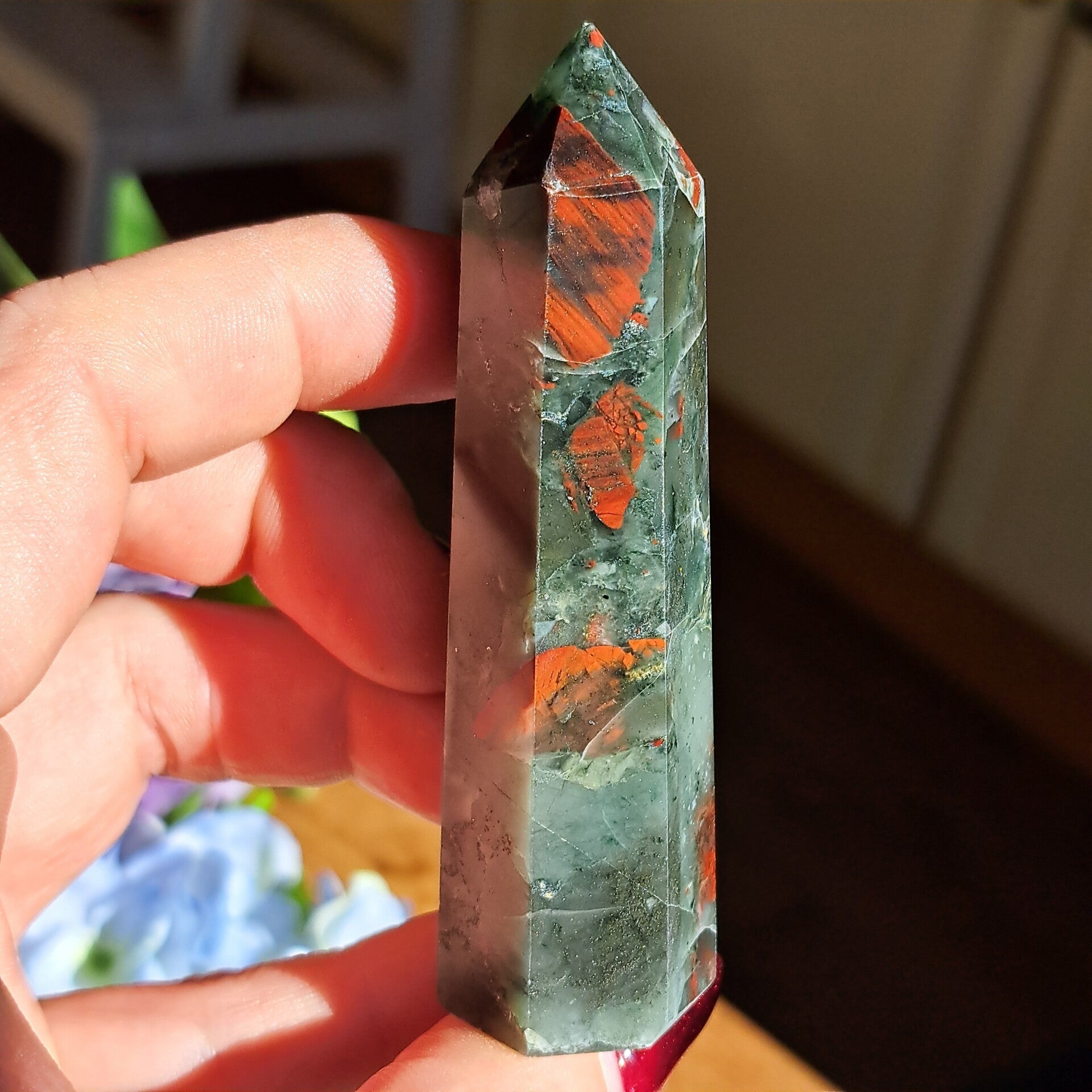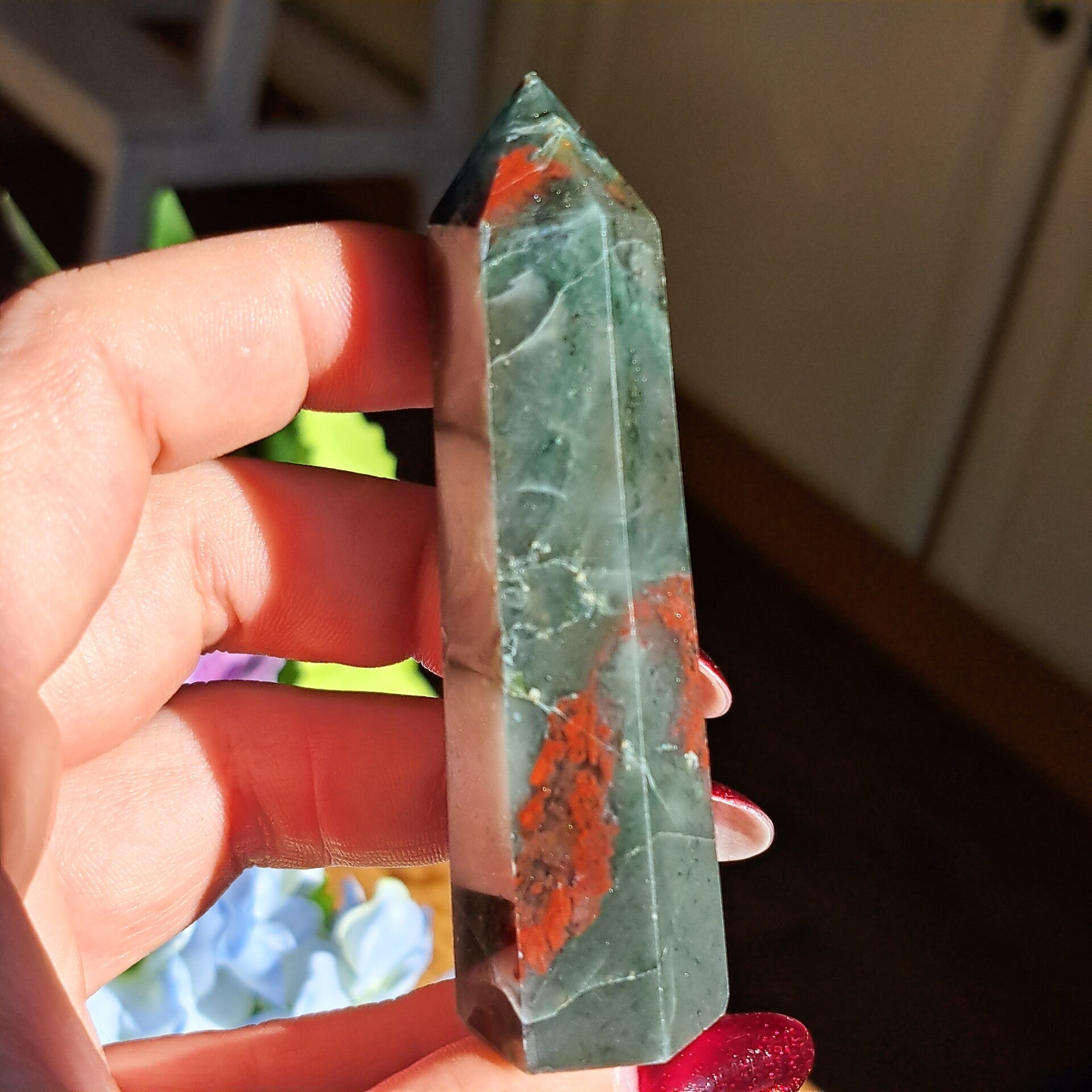 Deze gave punten uit Afrika zijn op de markt beter bekend als Afrikaanse Bloedsteen en is een combinatie van Rode Jaspis in Chalcedoon, vaak ook in combinatie met een beetje pyriet.