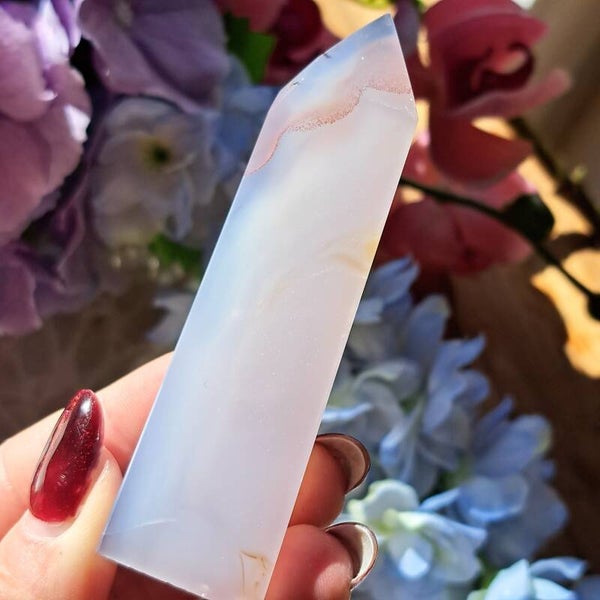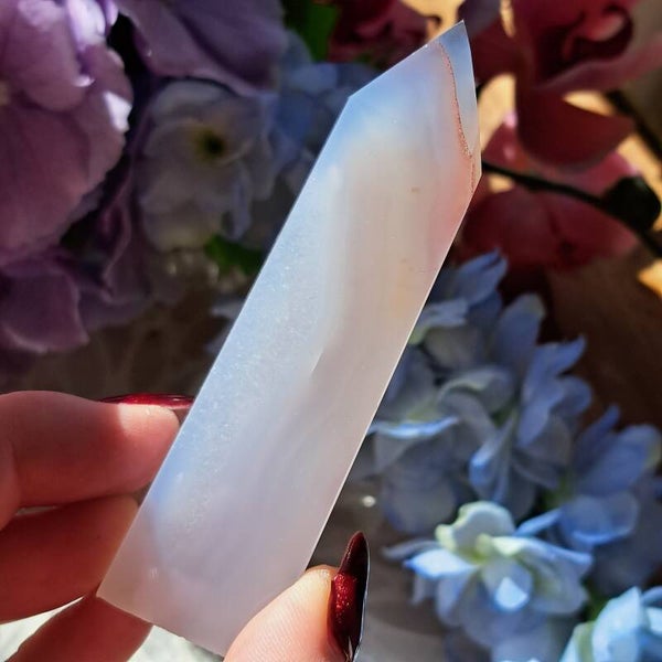 Deze punt van lichtblauwe met Rozige Chalcedoon is 69 gram en 9,5cm groot.