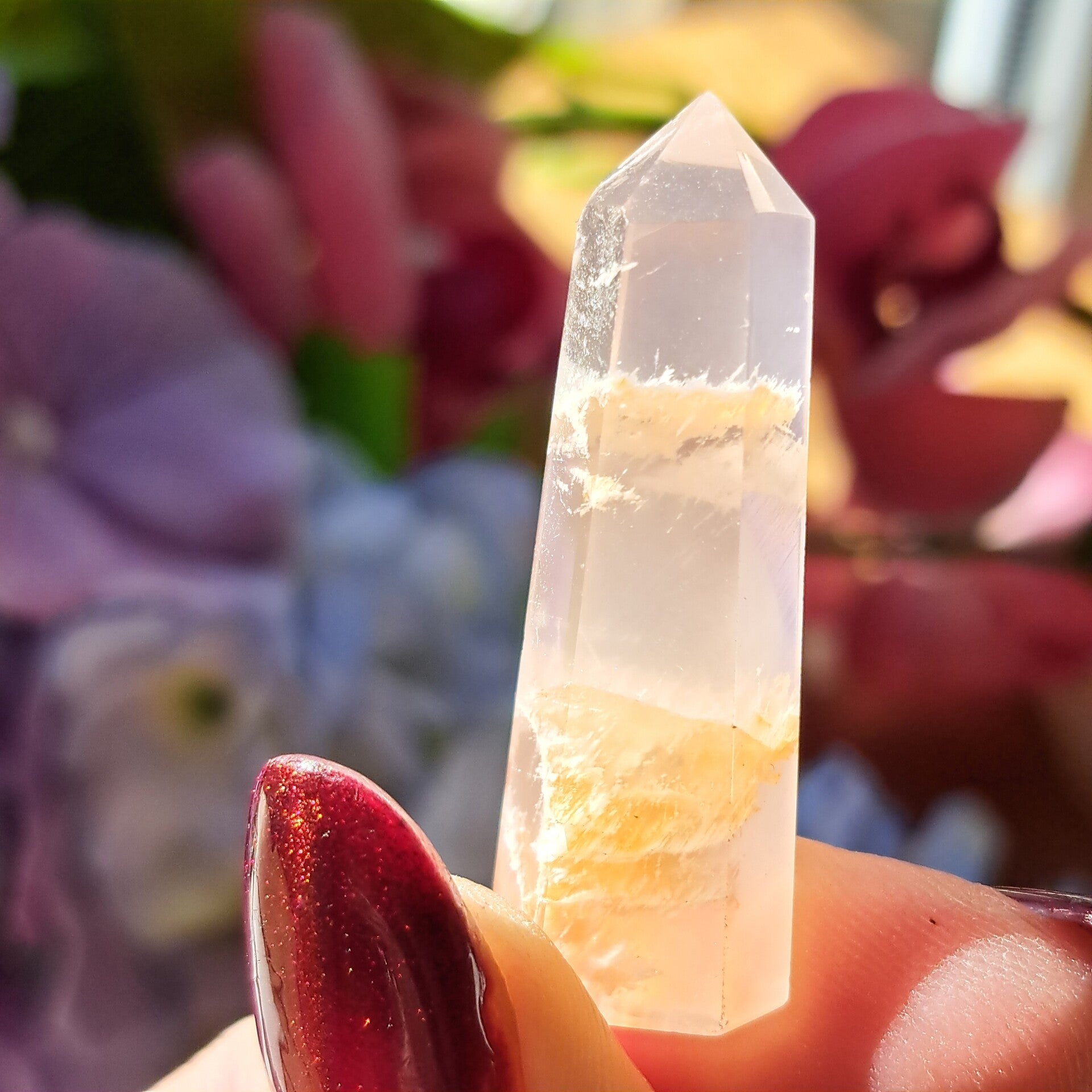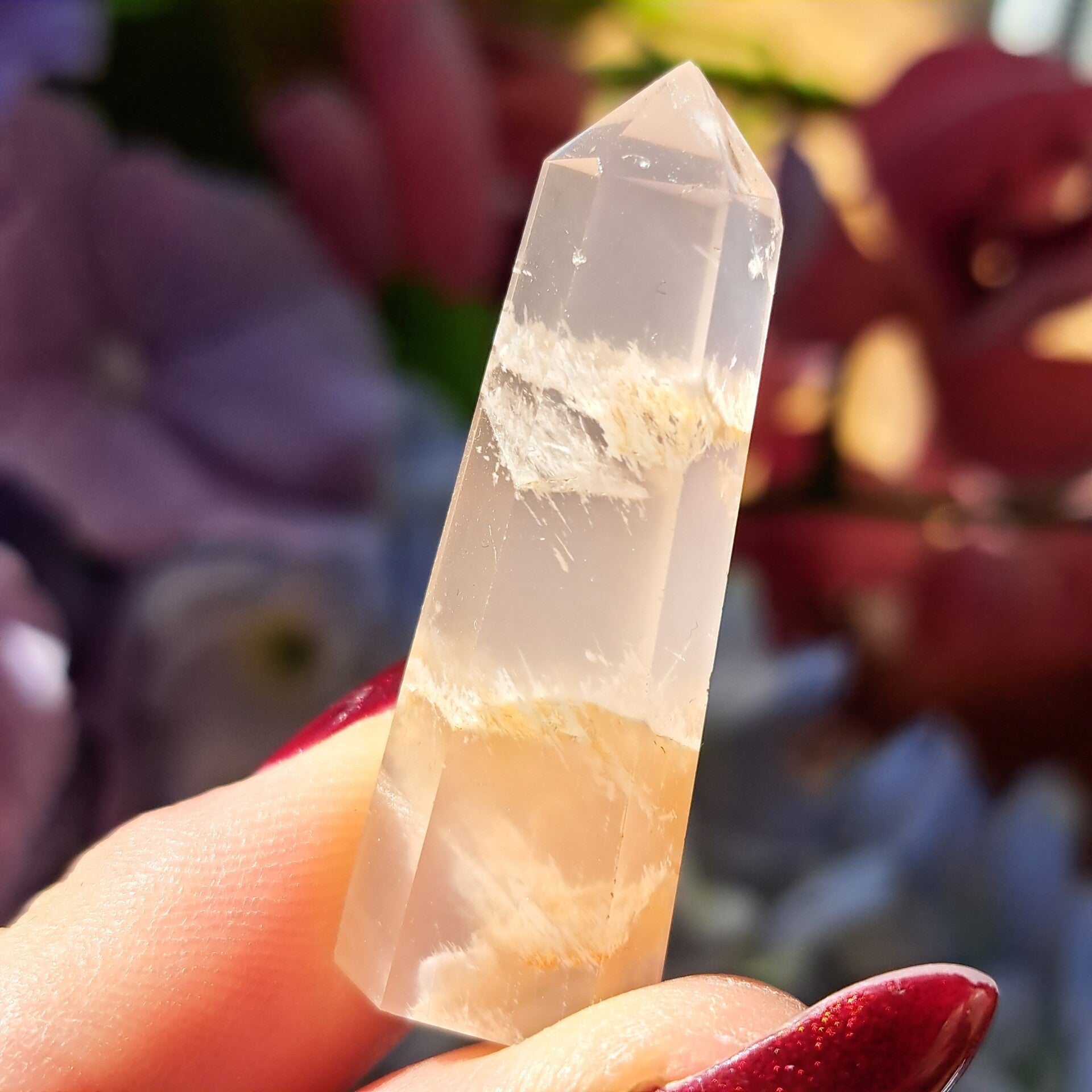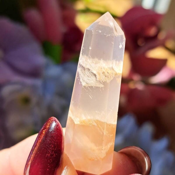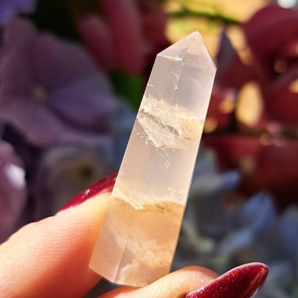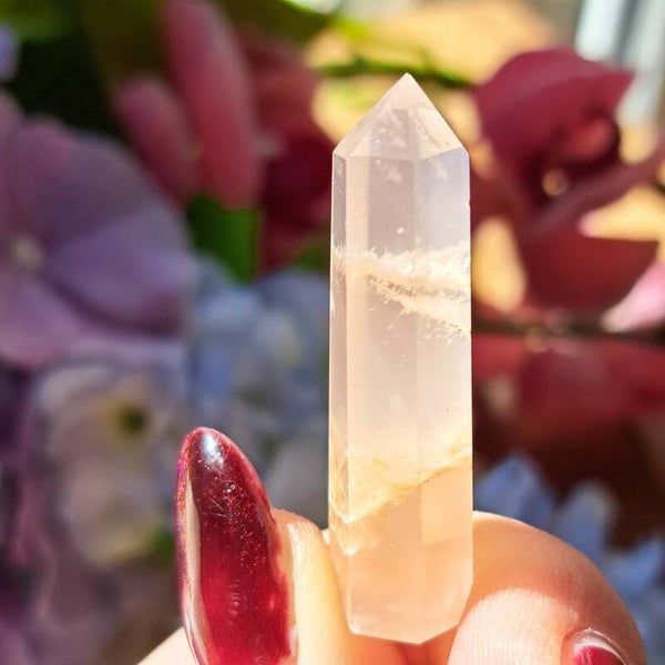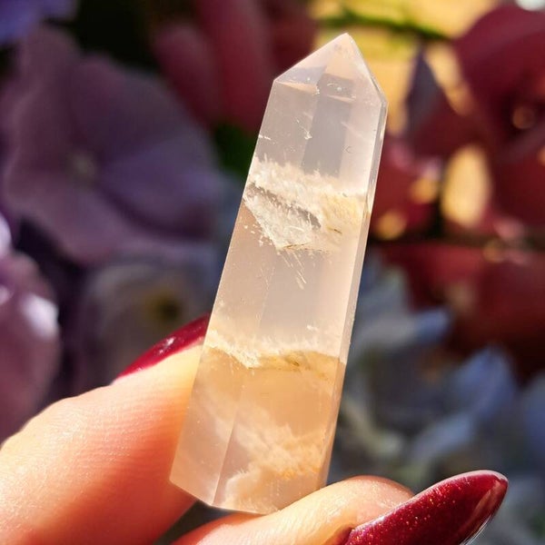 Dit toffe puntje, wat wel lijkt op en rozenkwarts lodoliet, met sericiet en witte amfibool insluitingen is een niet vaak voorkomende soort uit Brazilie en dit gave puntje is 4,1 cm groot .