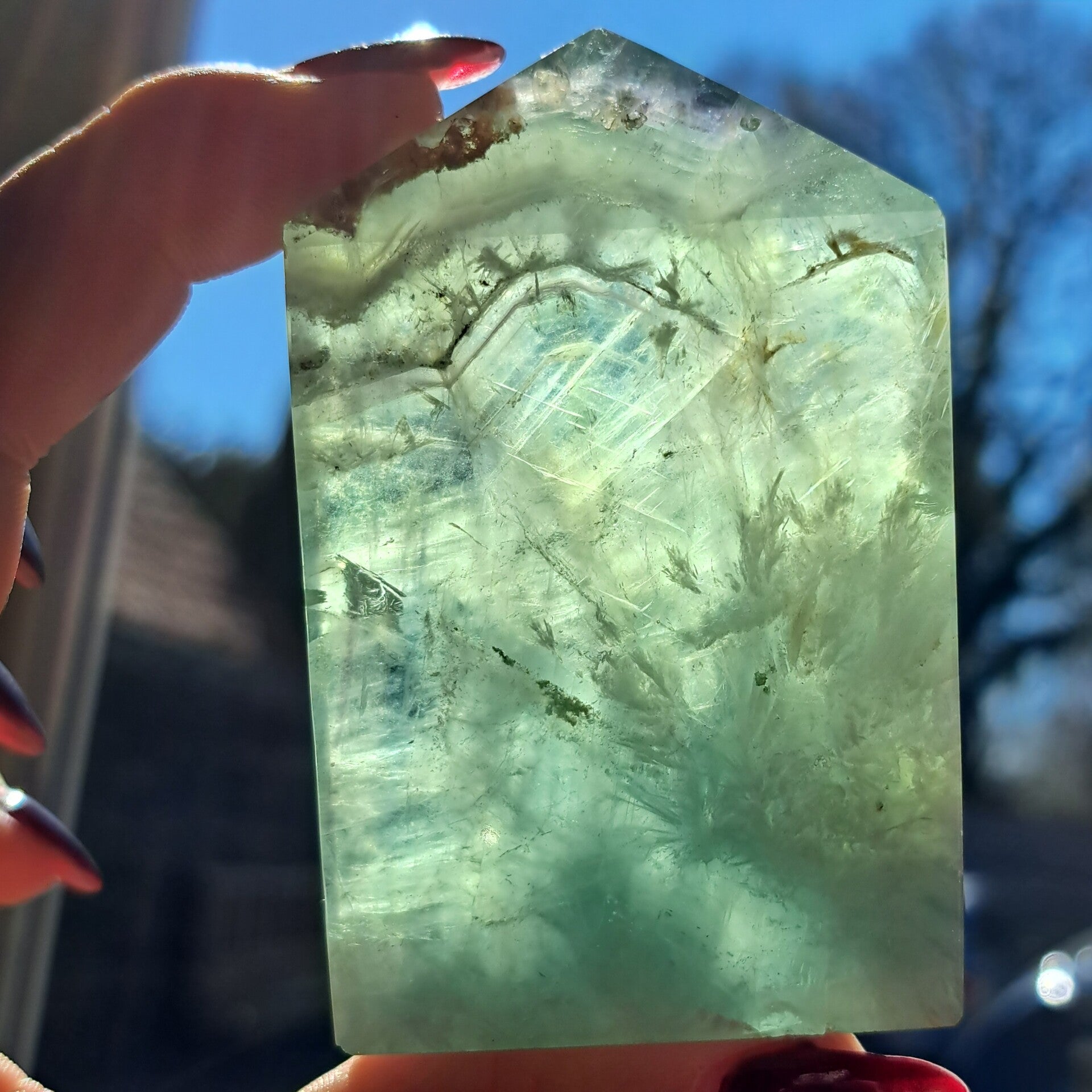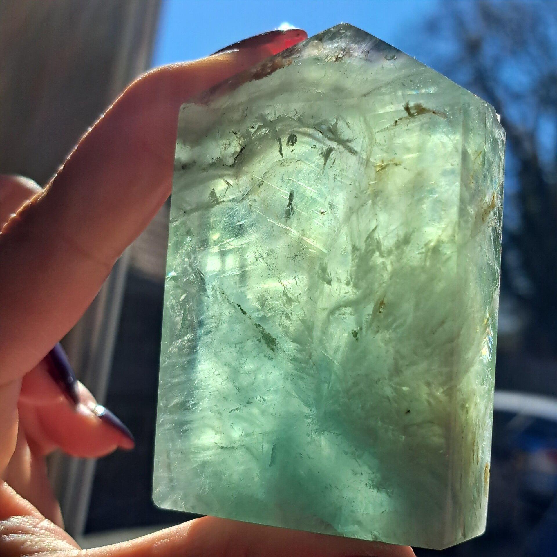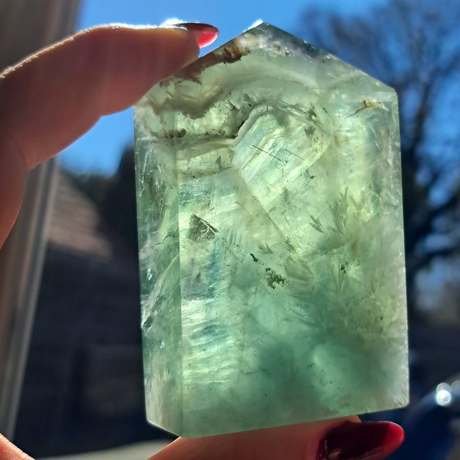 Deze punt van transparant groene fluoriet heeft typerende "Veer"insluitingen (Volgens recente onderzoeken moeten dit insluitingen van Bariet zijn) is 7,5 cm groot en weegt 200 gram. (Fel Blauw onder UV!)