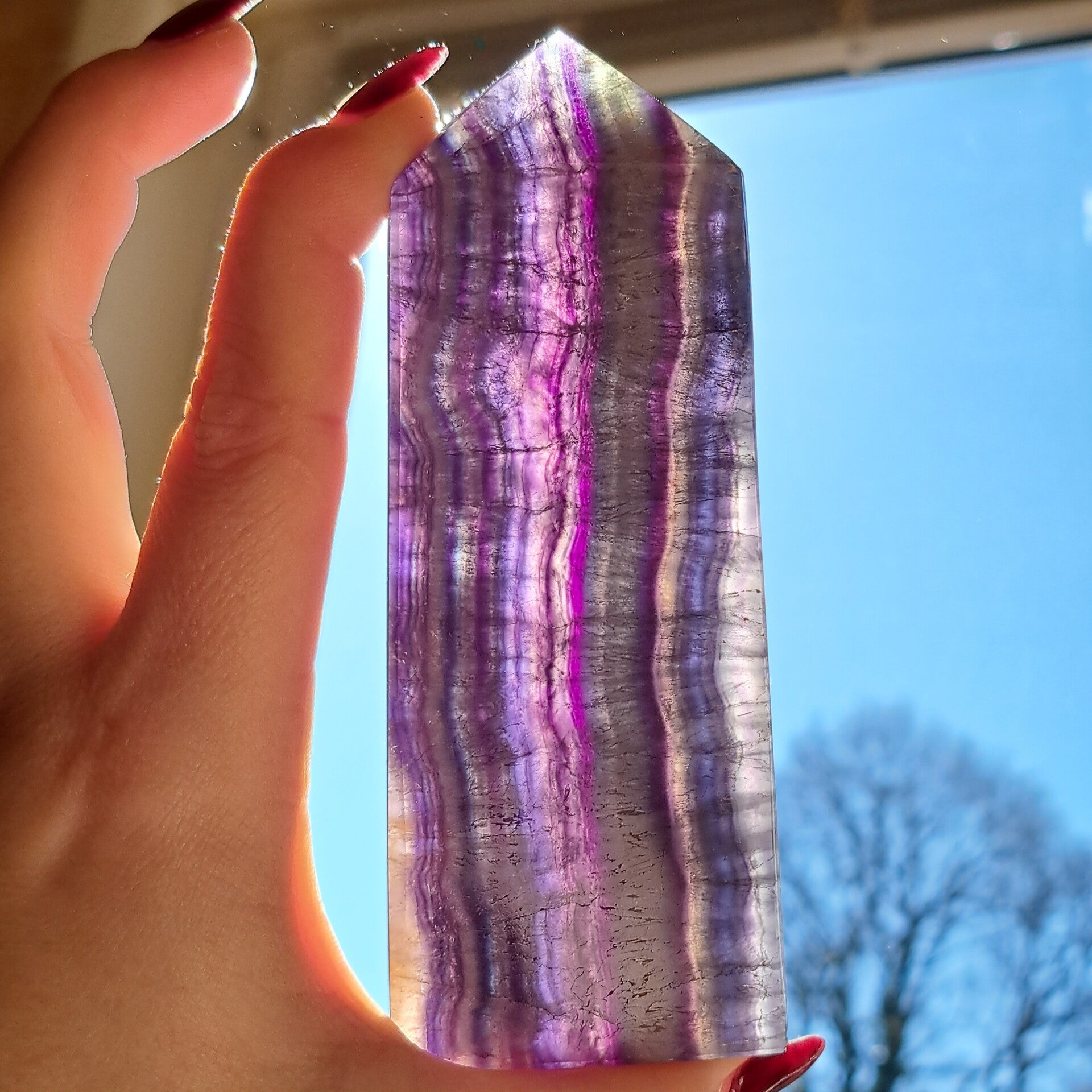 Deze punt van semi transparant paarse fluoriet heeft mooie silky achtige glans, schijnt prachtig door met een lichtje erachter en is 12,4 cm groot en weegt 331 gram.