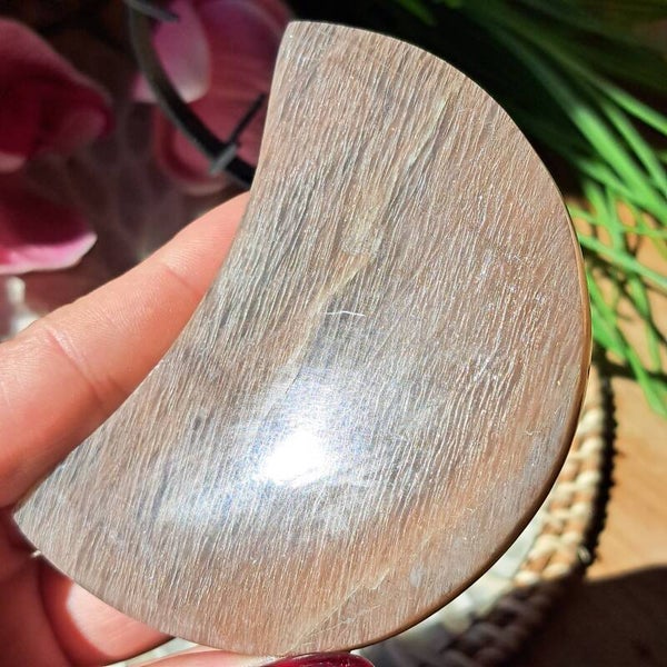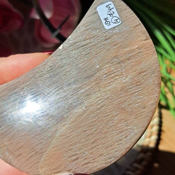 Deze gave perzik maansteen maan op zwart metalen voet heeft zowel zonnesteen als zilveren flash en is 18 cm hoog.
