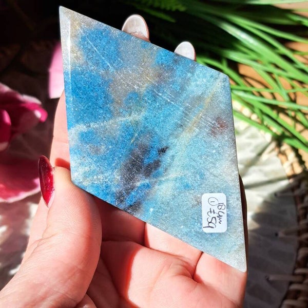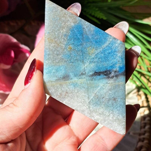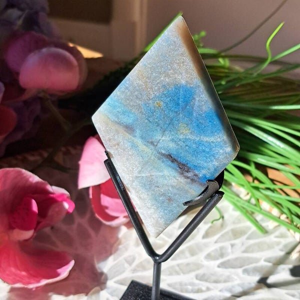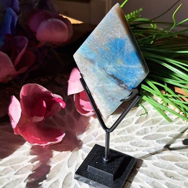 Deze gave ruit van Trolleiet komt uit Conquista Bahia, Brazilie staat op een zwart metalen voet en is totaal 18 cm hoog.