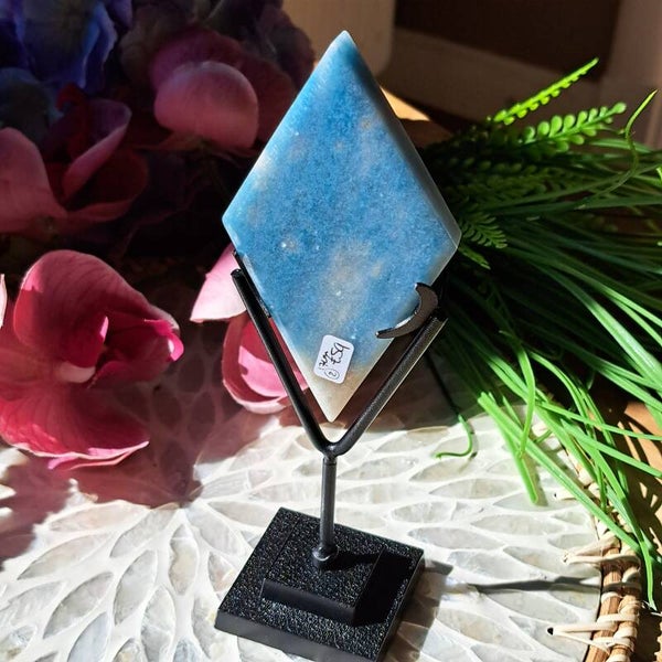Deze gave ruit van Trolleiet komt uit Conquista Bahia, Brazilie staat op een zwart metalen voet en is totaal 17 cm hoog.