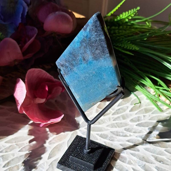 Deze gave ruit van Trolleiet komt uit Conquista Bahia, Brazilie staat op een zwart metalen voet en is totaal 17 cm hoog.