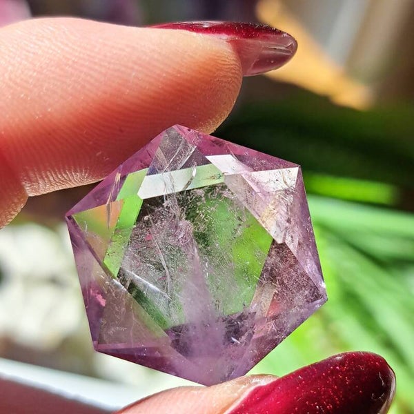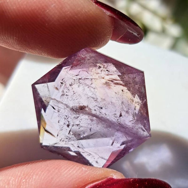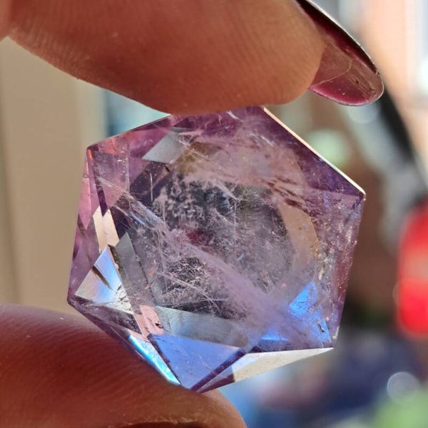 Deze toffe heldere Amethist is geslepen in prachtige hexagram vorm en is 2,6 cm groot.